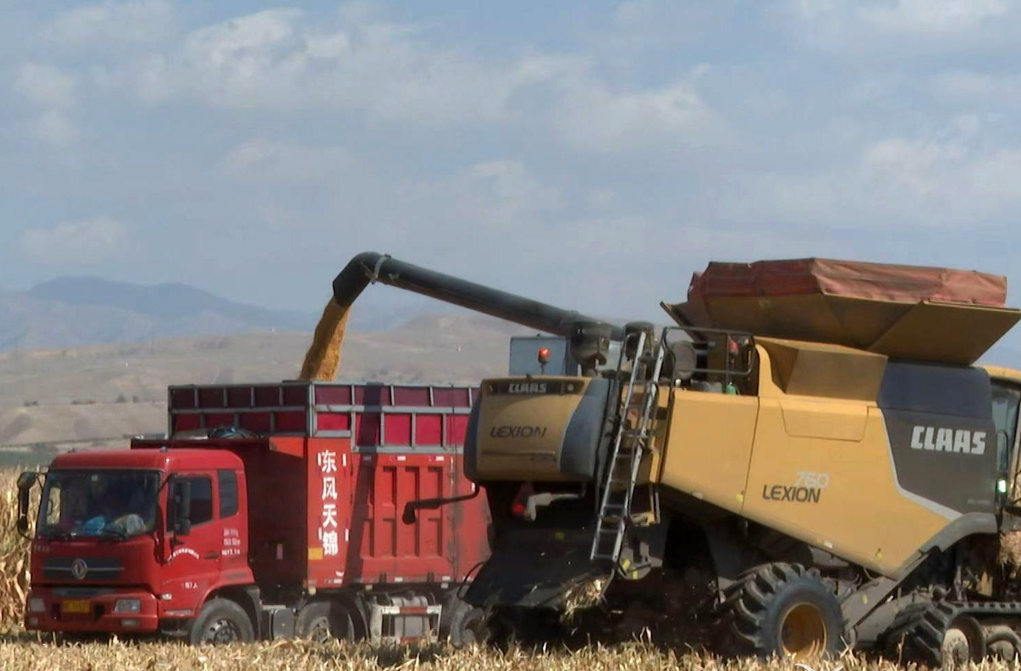 伊寧縣阿烏利亞鄉(xiāng),收割機(jī)在收割玉米。圖/伊犁融媒體中心提供