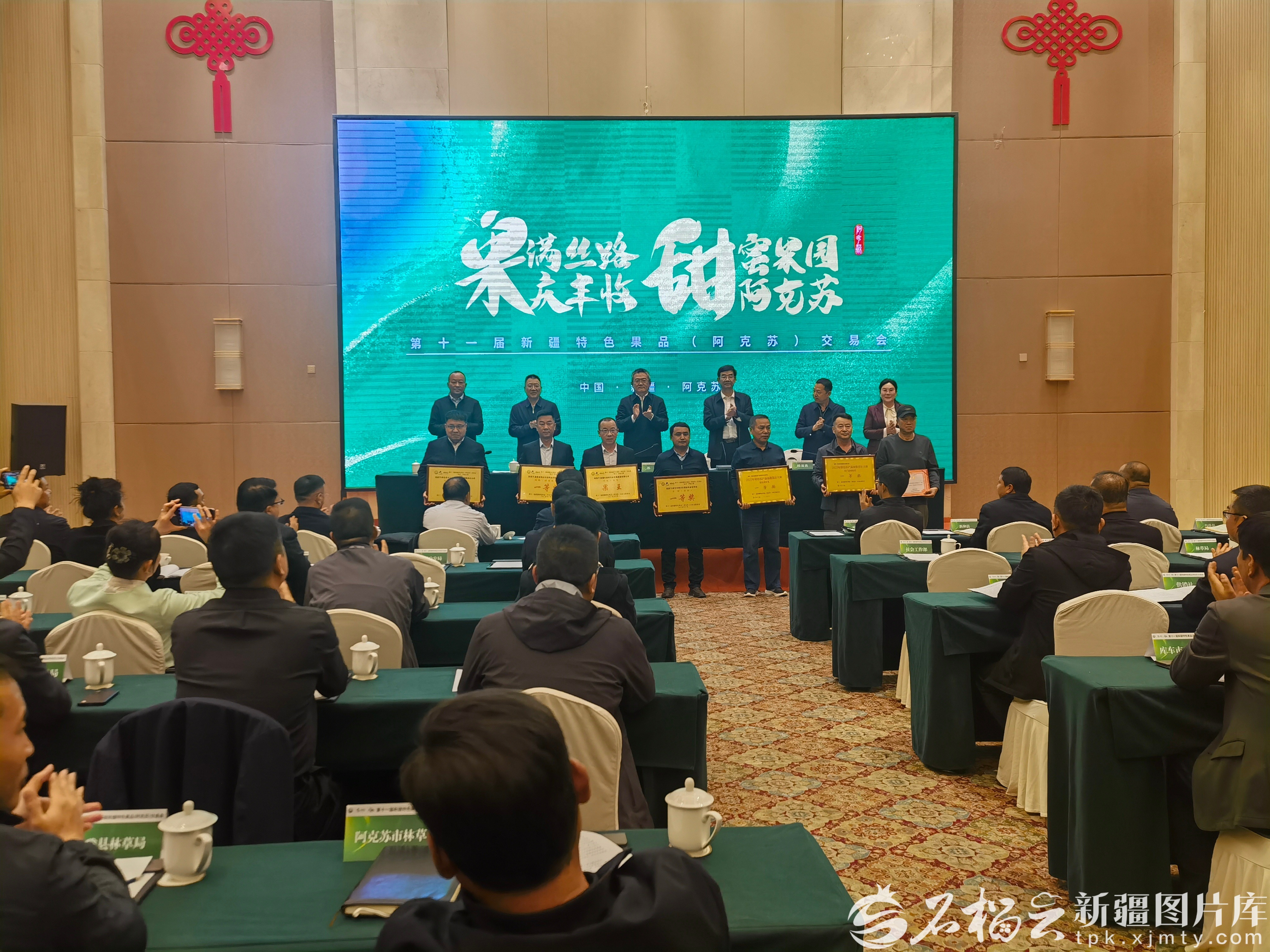 10月19日,在第十一屆新疆特色果品(阿克蘇)交易會(huì)閉幕式上,獲獎(jiǎng)單位與個(gè)人代表領(lǐng)獎(jiǎng)。天山網(wǎng)-新疆日?qǐng)?bào)記者 陳疆林?jǐn)z