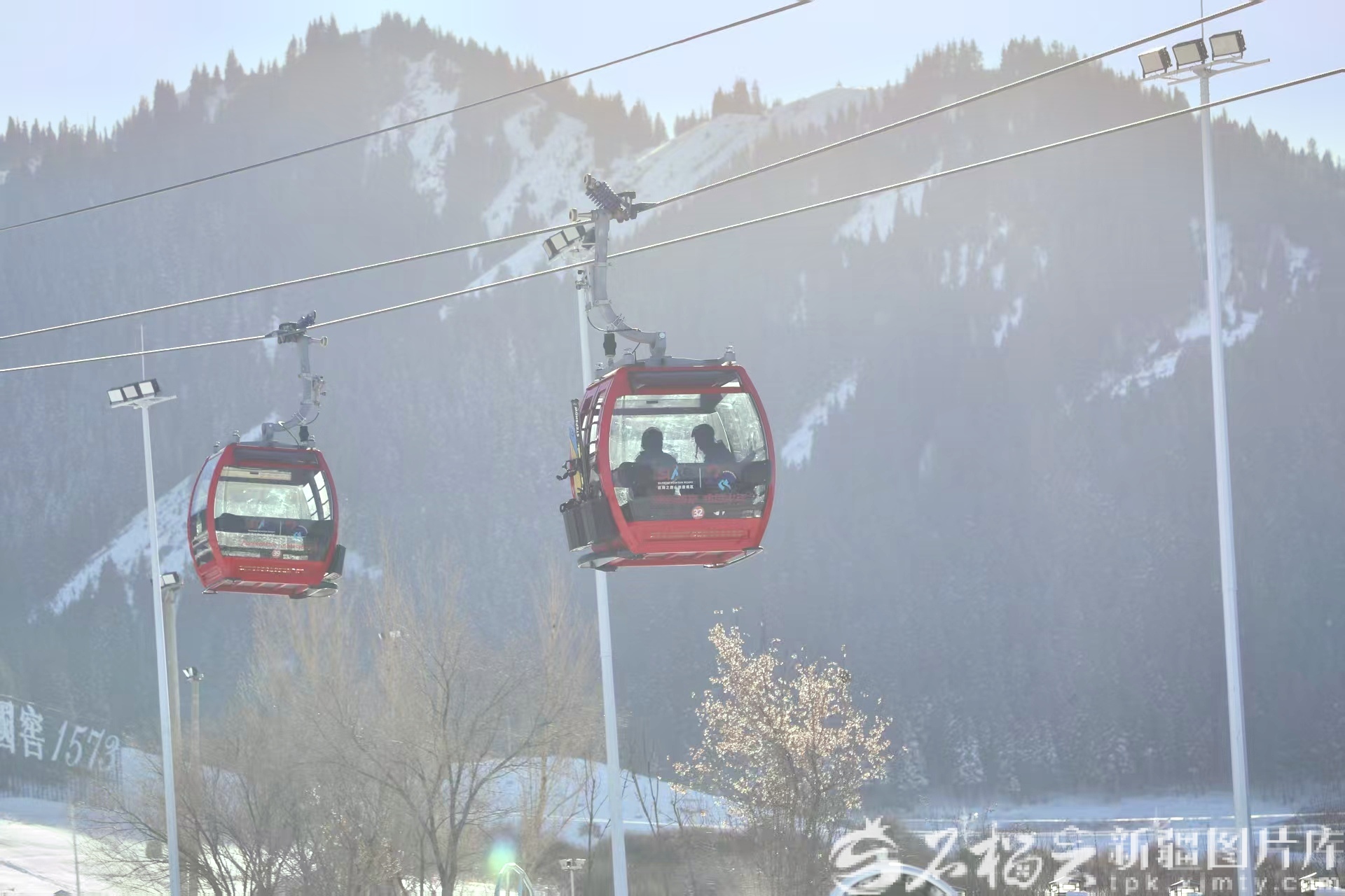 11月9日,在絲綢之路山地度假區(qū)東區(qū)滑雪場(chǎng),滑雪愛(ài)好者乘坐纜車(chē)前往滑雪大道。