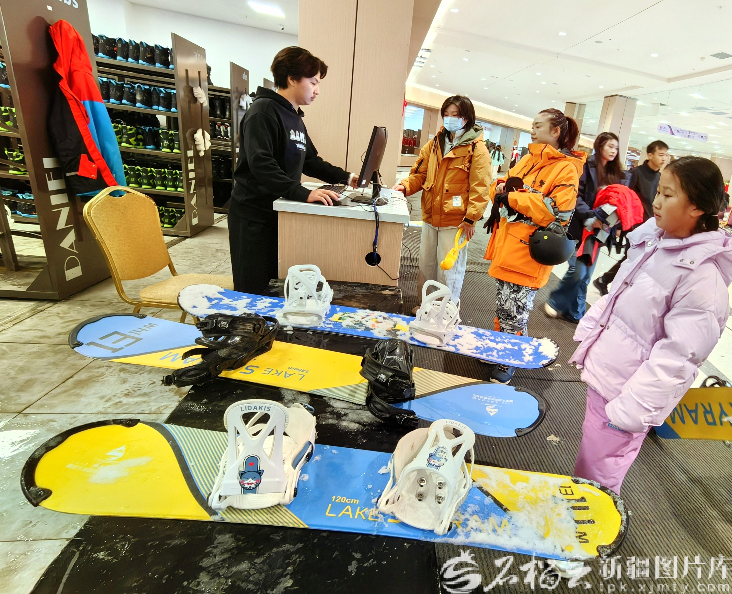 11月9日,在絲綢之路山地度假區(qū)東區(qū)滑雪場(chǎng),滑雪愛(ài)好者在領(lǐng)取雪具。