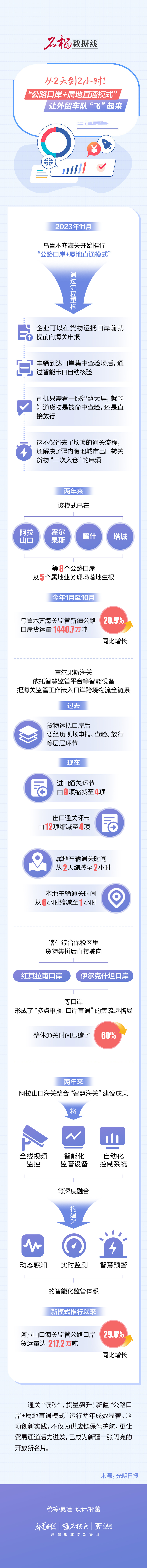 通關(guān)“讀秒”,貨量飆升!新疆“公路口岸+屬地直通模式”運(yùn)行兩年成效顯著。這項(xiàng)創(chuàng)新實(shí)踐,不僅為供應(yīng)鏈保駕護(hù)航,更讓貿(mào)易通道活力迸發(fā),已成為新疆一張閃亮的開(kāi)放新名片。