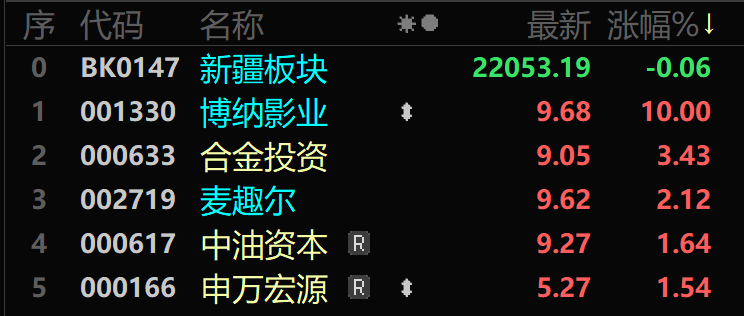 今日,博納影業(yè)上漲10.00%,報收9.68元;合金投資上漲3.43%,報收9.05元;麥趣爾上漲2.12%,報收9.62元;中油資本上漲1.64%,報收9.27元;申萬宏源上漲1.54%,報收5.27元。*ST天山、熙菱信息、寶地礦業(yè)、貝肯能源、北新路橋跌幅居前。