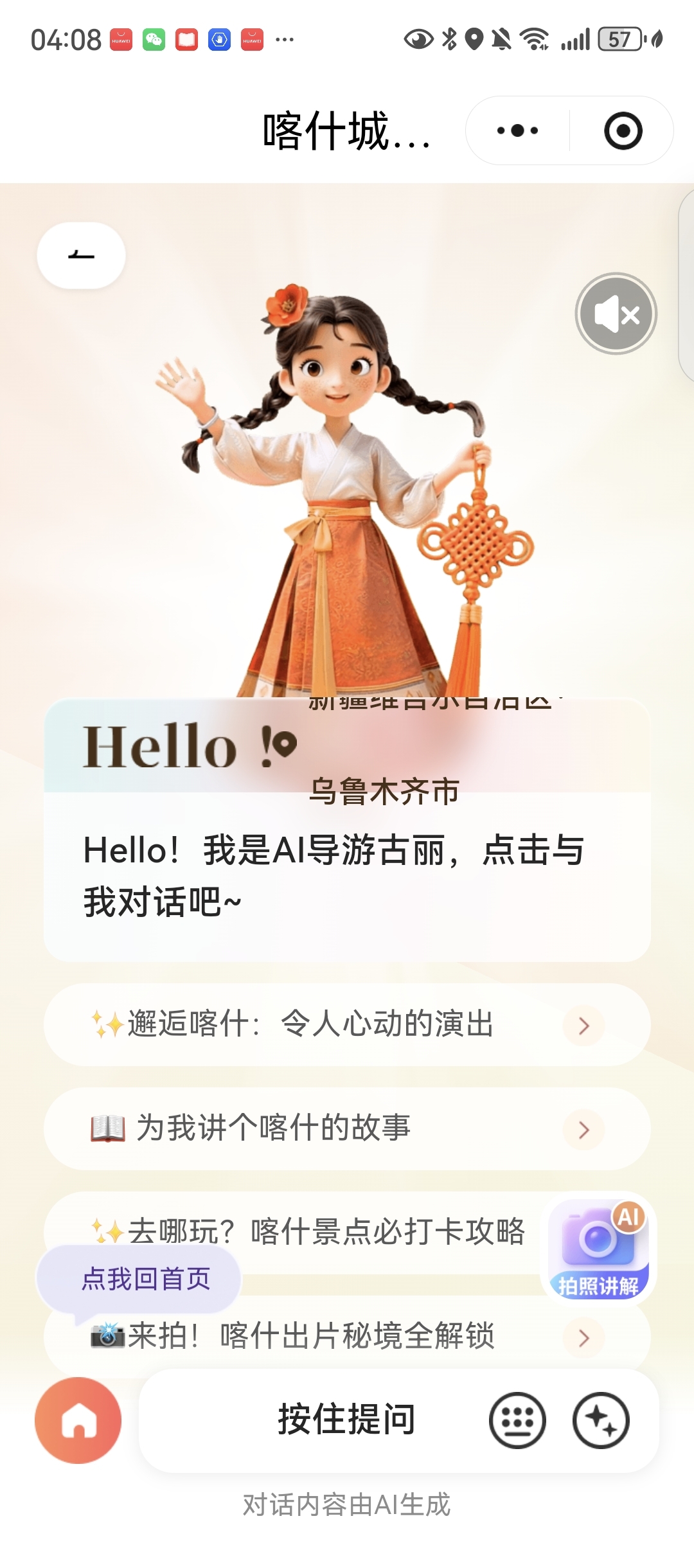 “樂游喀什”小程序中內(nèi)置的“AI 導(dǎo)游古麗”可為游客提供多種服務(wù)。截圖自“樂游喀什”小程序