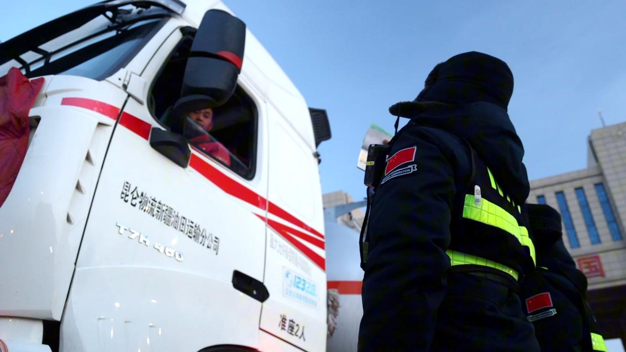 阿拉山口邊檢站民警對(duì)貨車(chē)司機(jī)進(jìn)行人證核對(duì)。徐超 攝