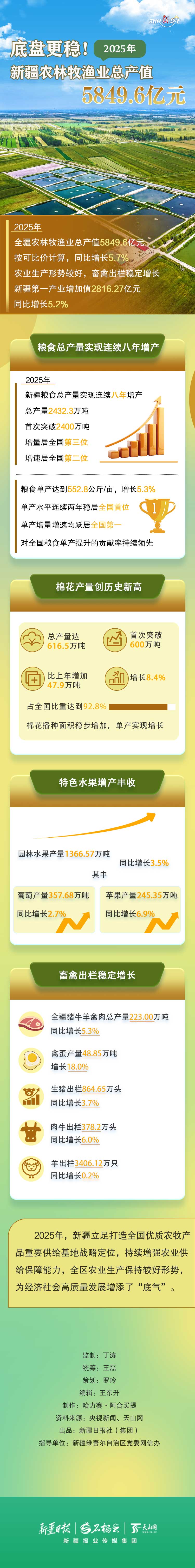 數(shù)說“新”變化|底盤更穩(wěn)!2025年新疆農(nóng)林牧漁業(yè)總產(chǎn)值5849.6億元