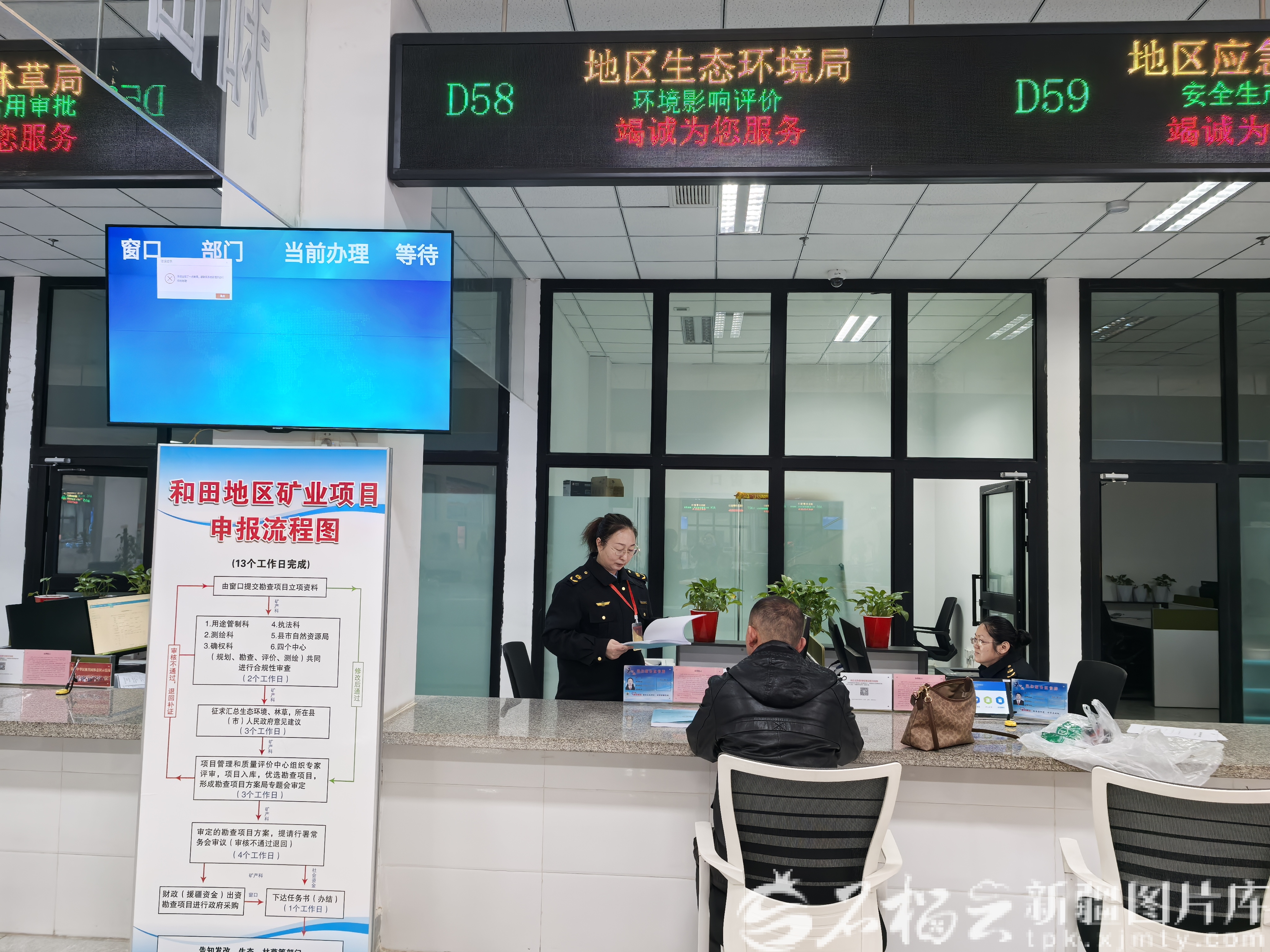 2月4日,在和田地區(qū)政務(wù)服務(wù)中心生態(tài)環(huán)境局窗口,工作人員正在接待前來申請(qǐng)辦理環(huán)評(píng)審批的企業(yè)人員。張雪平 攝