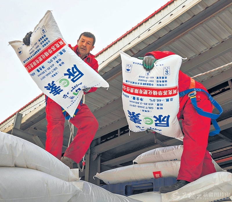 2月25日,工人在位于庫(kù)車市的阿克蘇華錦化肥有限責(zé)任公司裝運(yùn)化肥。該公司正開足馬力加緊生產(chǎn),保障春耕。袁歡歡攝