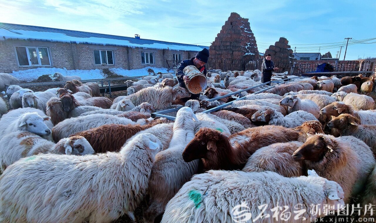 2024年2月17日,牧民在察布查爾錫伯自治縣察布查爾鎮(zhèn)烏宗布拉克農(nóng)村社區(qū)養(yǎng)殖區(qū)給羊添加玉米顆粒飼料。華巖明 攝