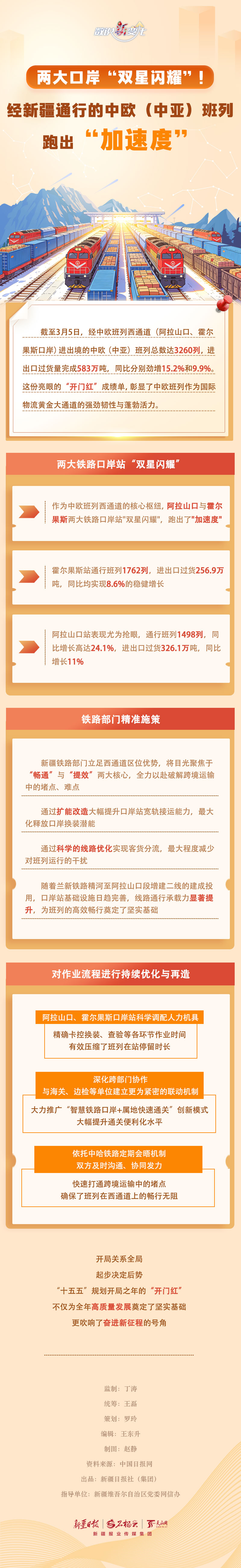 截至3月5日,今年經(jīng)中歐班列西通道(阿拉山口、霍爾果斯口岸)進出境的中歐(中亞)班列總數(shù)達3260列,進出口過貨量完成583萬噸,同比分別勁增15.2%和9.9%。作為中歐班列西通道的核心樞紐,阿拉山口與霍爾果斯兩大口岸表現(xiàn)如何? 新疆鐵路部門為保障班列高效暢行做了哪些努力?本期《數(shù)說“新”變化》一起來看看。