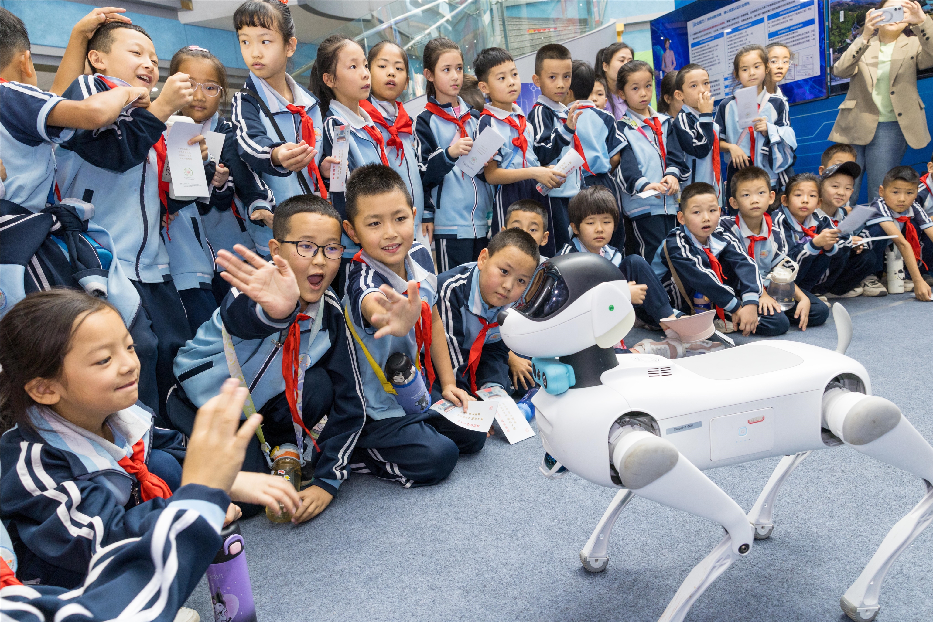 9月5日,烏魯木齊市第73小學(xué)學(xué)生在新疆科技館舉行的“科技與現(xiàn)代文明同行”體驗展現(xiàn)場與機(jī)器狗互動。 孫振嵩攝