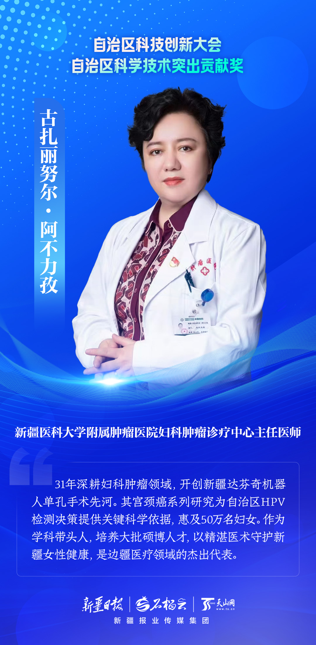 31年深耕婦科腫瘤領域,開創(chuàng)新疆達芬奇機器人單孔手術先河。其宮頸癌系列研究為自治區(qū)HPV檢測決策提供關鍵科學依據,惠及50萬名婦女。作為學科帶頭人,培養(yǎng)大批碩博人才,以精湛醫(yī)術守護新疆女性健康,是邊疆醫(yī)療領域的杰出代表。