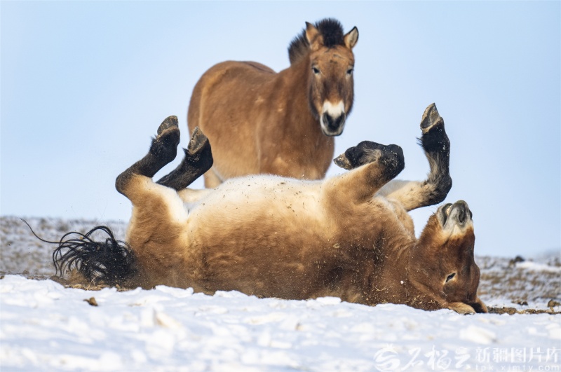 12月18日,新疆卡拉麥里山有蹄類(lèi)野生動(dòng)物自然保護(hù)區(qū)喬木西拜普氏野馬監(jiān)測(cè)站,普氏野馬在雪地里打滾撒歡。何龍攝