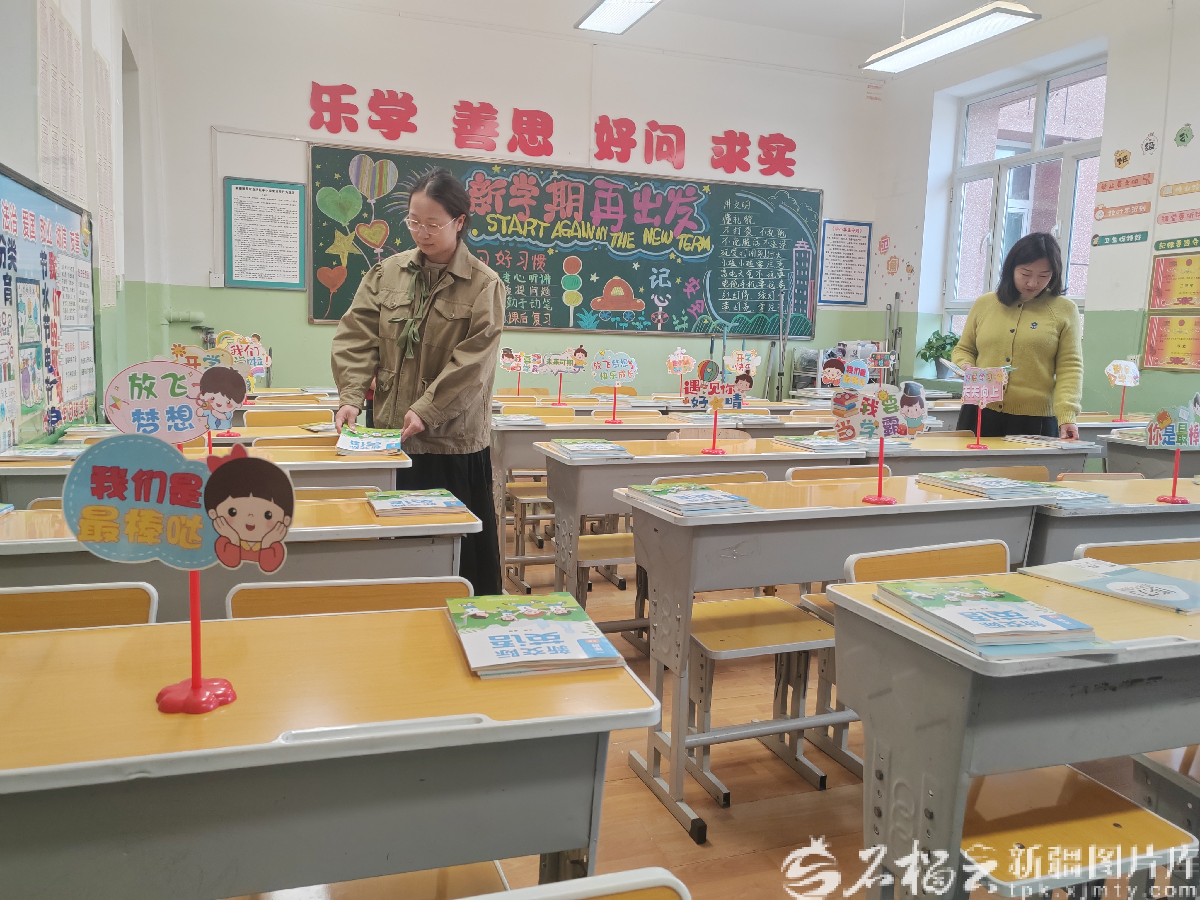 精心設(shè)計(jì)的新學(xué)期開學(xué)板報(bào),課桌上擺放著嶄新的課本。2月27日,提前到崗的烏魯木齊市第35小學(xué)教師們將教室裝扮一新,校園里洋溢著迎接新學(xué)期的開學(xué)氛圍。