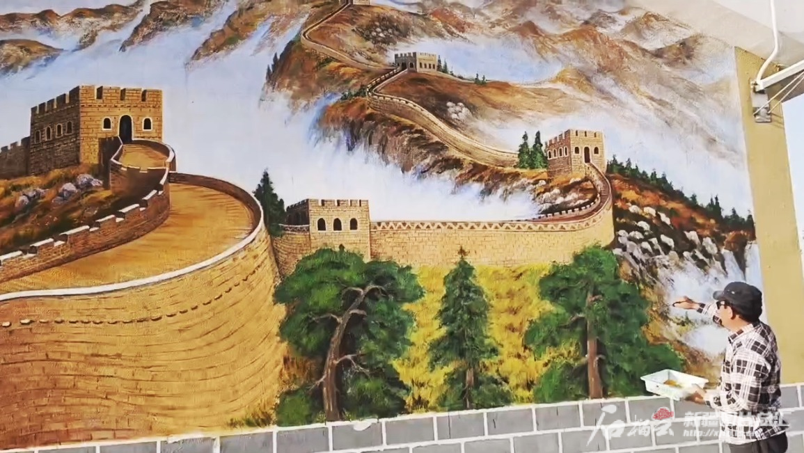 在于田縣木尕拉鎮(zhèn)友誼村,奧斯曼江·麥提庫(kù)爾班正在墻面上畫(huà)長(zhǎng)城。本人供圖