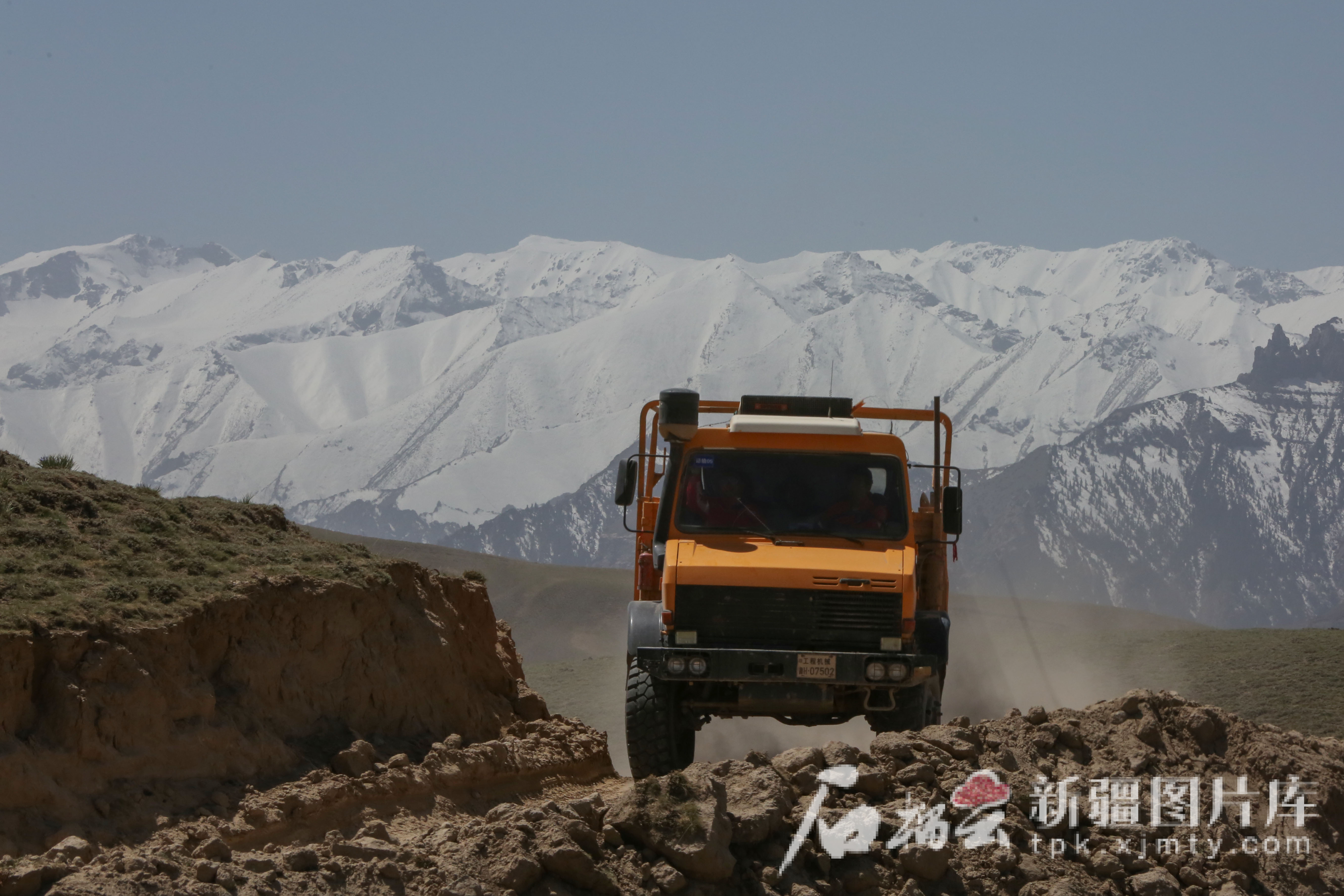 4月29日,物探施工車輛行駛在昆侖山巔。