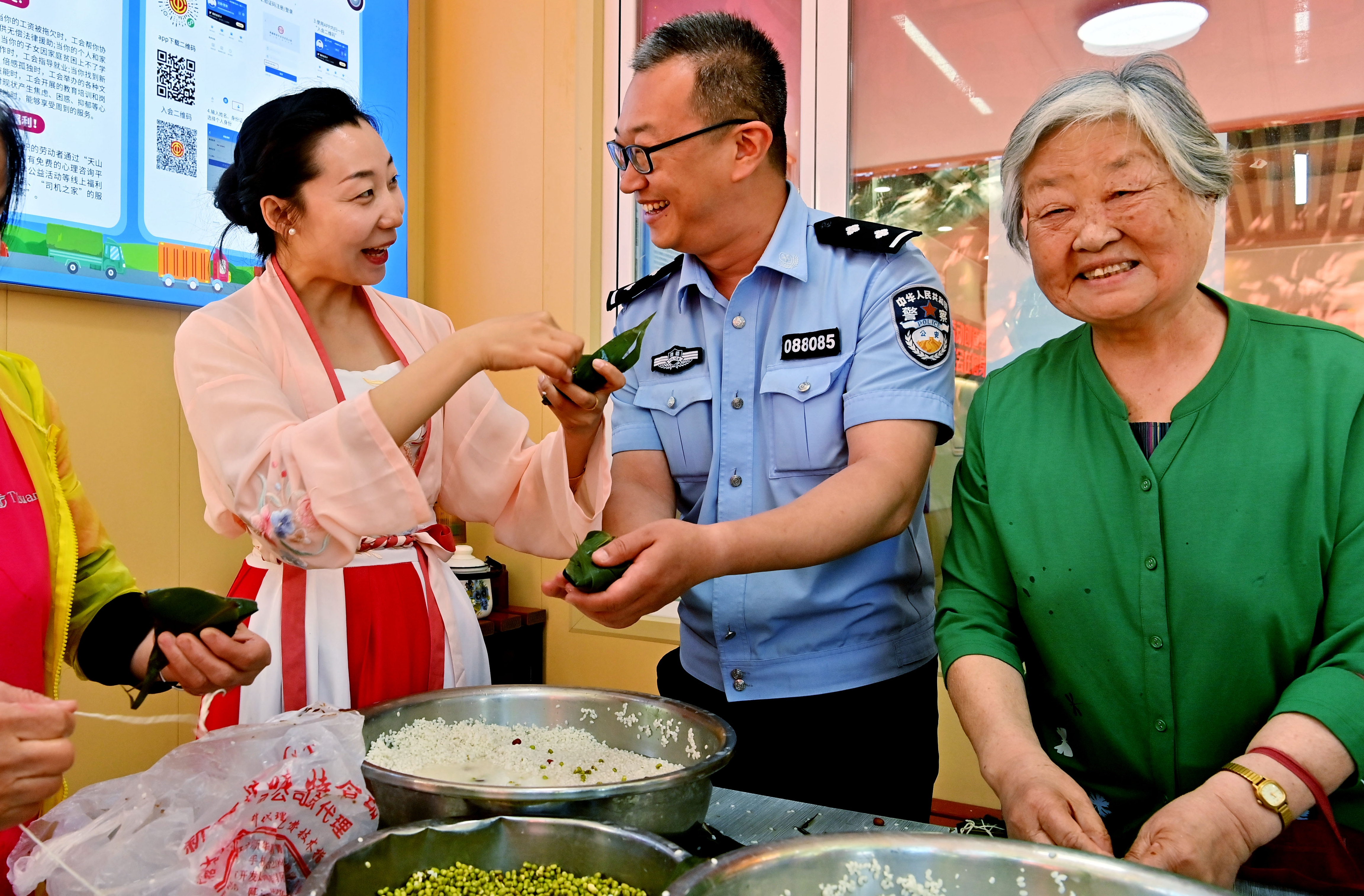民警和居民一起包粽子。天山網(wǎng)-新疆法治報記者 單坤攝