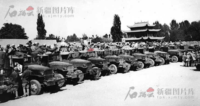 1949年10月12日,二軍四師和戰(zhàn)車五團裝甲車營作為入疆先頭部隊,從玉門出發(fā),驅車西進。13日,二軍軍指、五師離開酒泉,向新疆挺進?!鞍籽┱制钸B,烏云蓋山巔;草原秋風狂,凱歌進新疆”,高唱著王震作詞、王洛賓作曲的這首《凱歌進新疆》,幾萬人馬,數路大軍,如滾滾洪流,奔騰西進,銳不可當,向新疆展開了氣勢磅礴的大進軍。