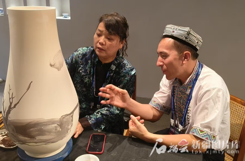 中國工藝美術(shù)大師徐嵐(左)與阿克陶縣巴仁鄉(xiāng)薩依巴格村土陶燒制工藝第7代非物質(zhì)文化遺產(chǎn)代表性傳承人奧布力塔力普·阿吉,在江西省景德鎮(zhèn)市陶源谷三寶螢造體驗店交流(2024年10月19日攝)。圖片由江西援疆前方指揮部提供