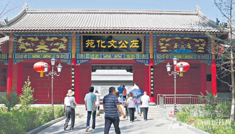 由河南省援疆資金建設的左公文化苑在哈密市伊州區(qū)落成,至今已接待游客30多萬人次。圖為游客參觀左公文化苑(2021年10月5日攝)。伊軒攝