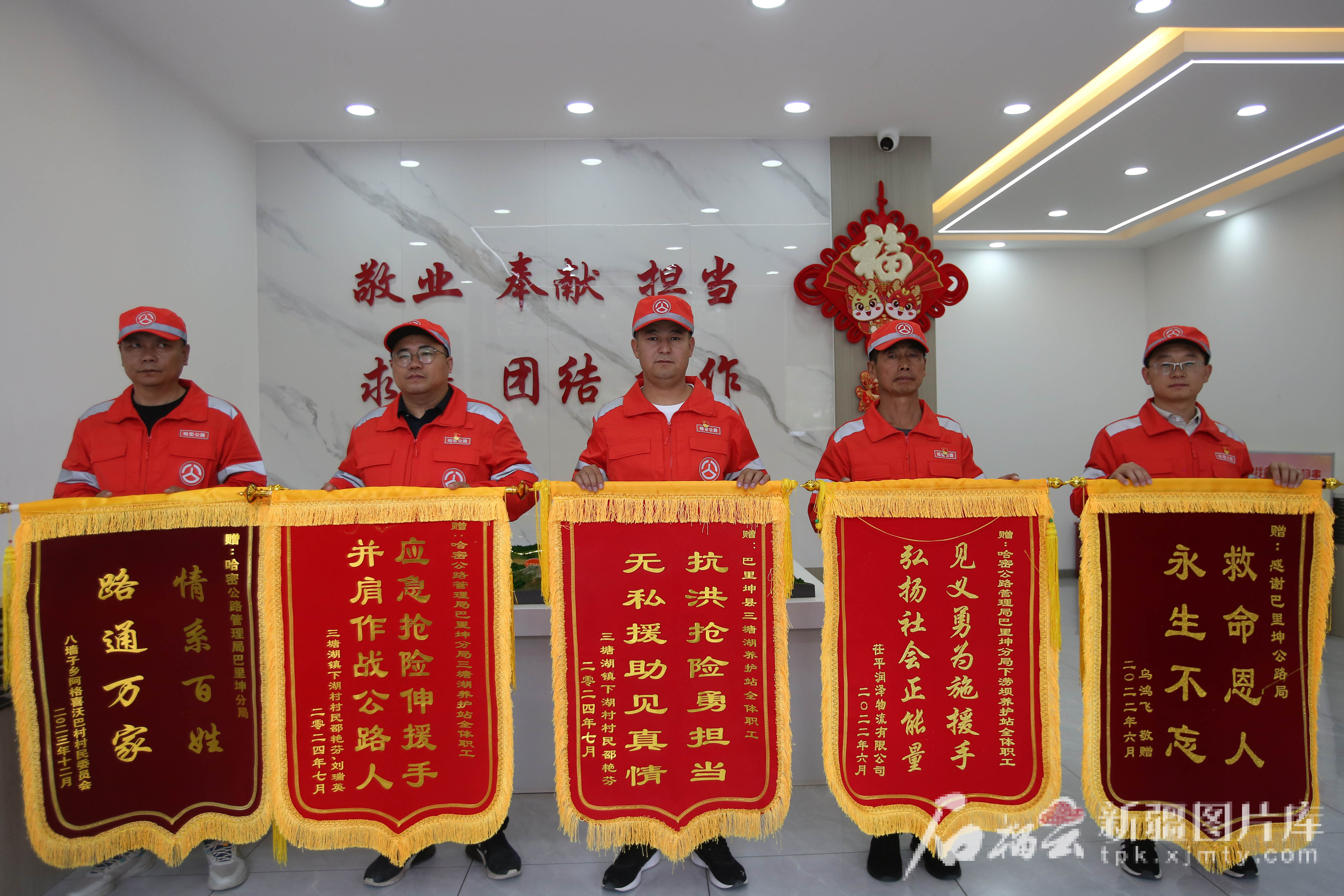 7月6日,哈密公路事業(yè)發(fā)展中心巴里坤養(yǎng)護(hù)所工作人員在展示錦旗。