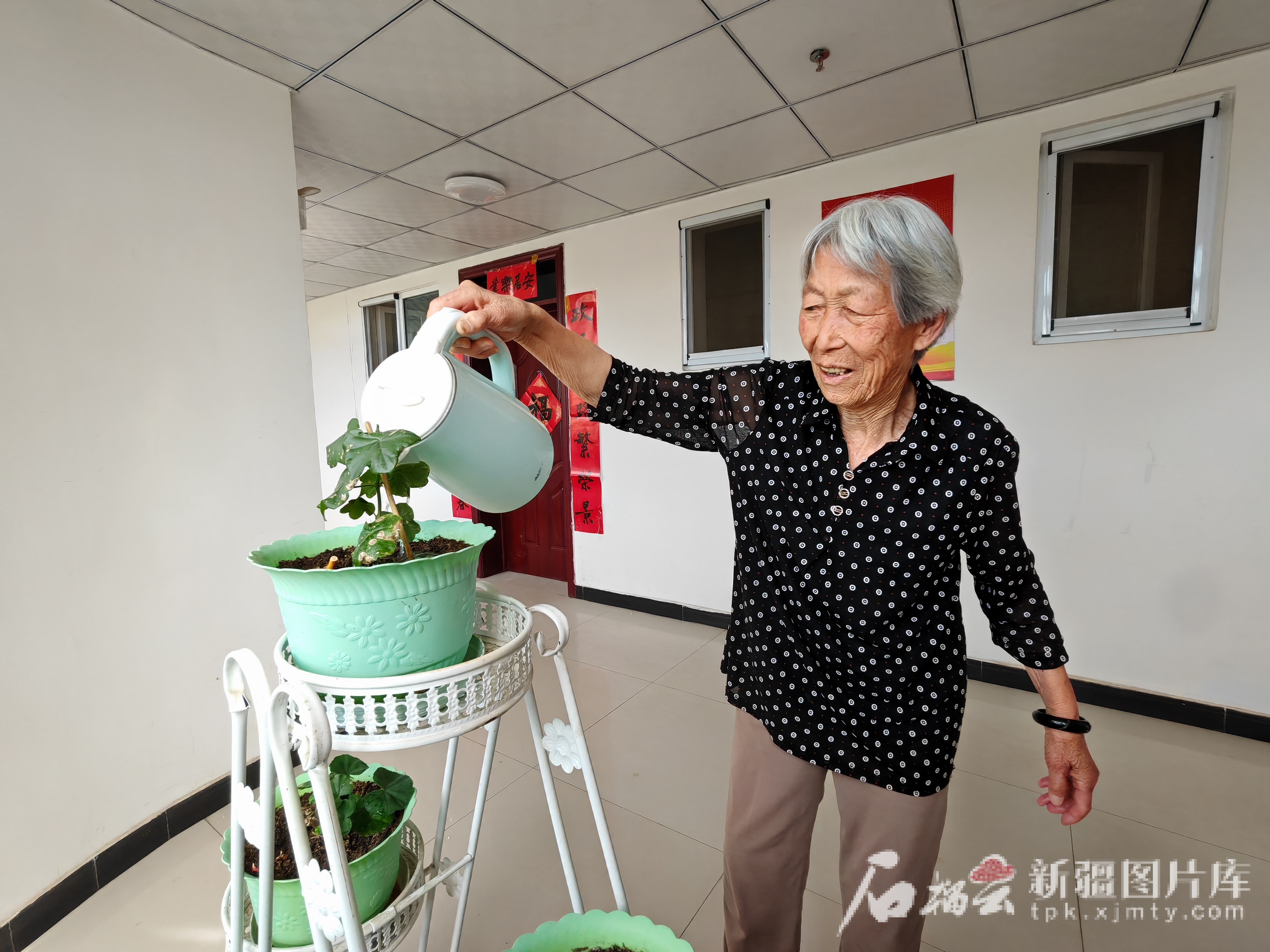 黃國珍老人在澆花。天山網(wǎng)-新疆日報記者逯風暴 攝