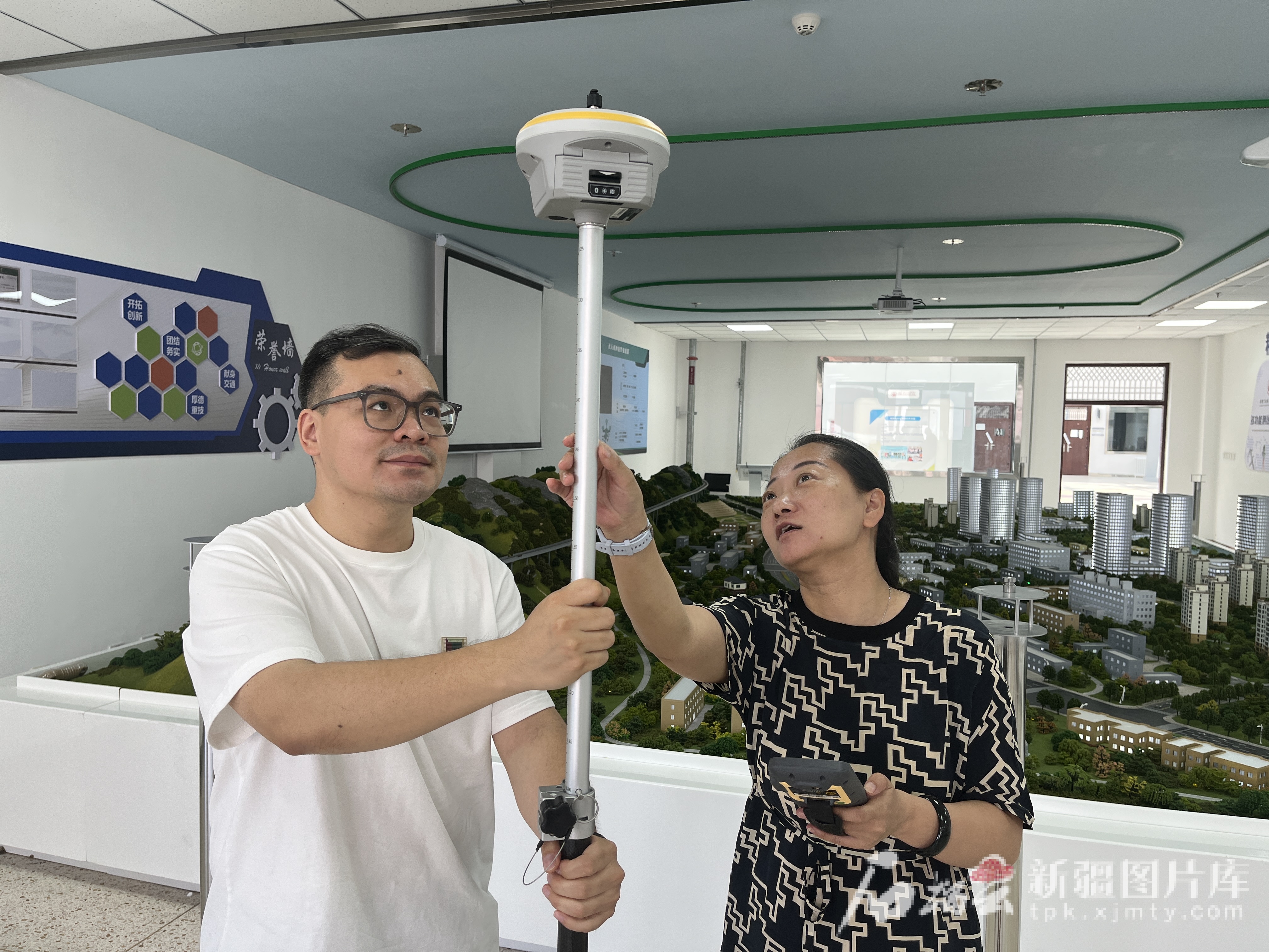 7月16日,在新疆交通職業(yè)技術(shù)學(xué)院道路橋梁工程學(xué)院,工程測量技術(shù)專業(yè)負責人張慧(右)演示RTK數(shù)據(jù)采集。天山網(wǎng)-新疆日報記者 任春香攝