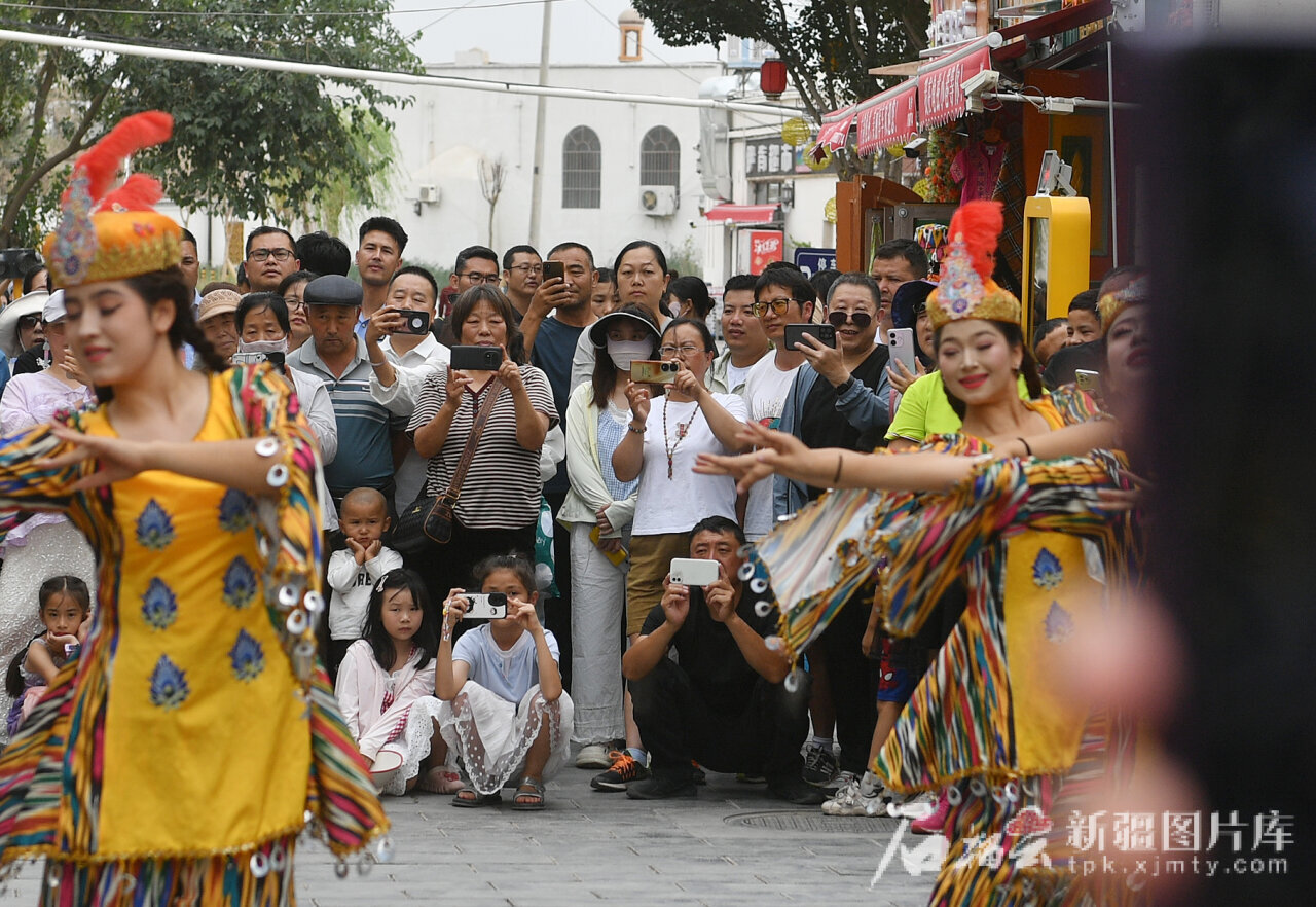 7月27日,游客在龜茲小巷觀看舞蹈表演。