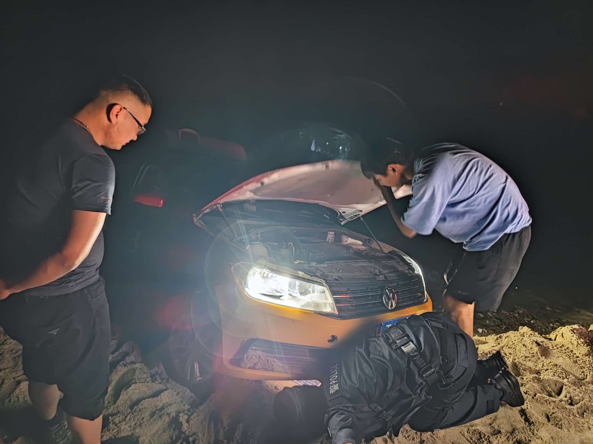 趕到時(shí),民警看到越野車(chē)車(chē)輪幾乎已全部沒(méi)入沙中,同行的6名游客試了各種辦法,卻徒勞無(wú)功。“本來(lái)想抄近道去看日落,沒(méi)想到這沙子看著硬,底下全是虛的。”老李搓著手,對(duì)眼前的一切十分懊悔。