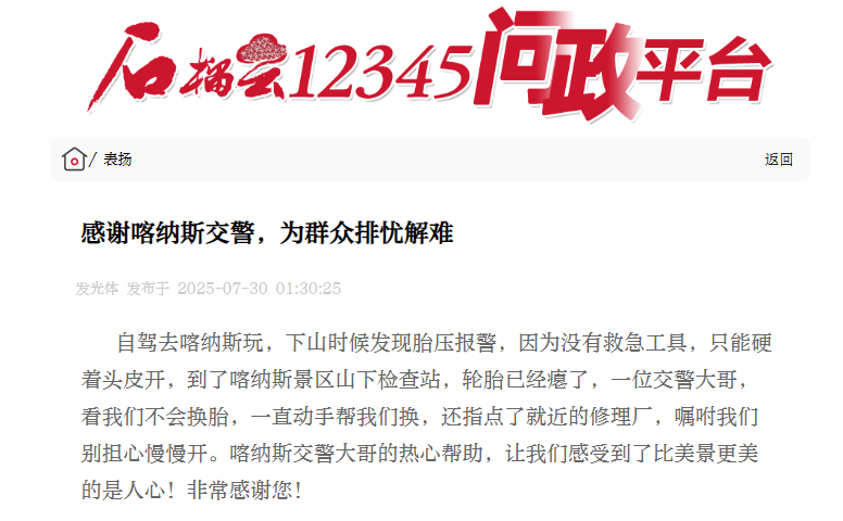 天山網(wǎng)-新疆日?qǐng)?bào)訊(記者趙茜報(bào)道)“交警大哥的熱心幫助,讓我們感受到了比美景更美的是人心!”近日,網(wǎng)友余先生在石榴云 12345 問(wèn)政平臺(tái)的一條表?yè)P(yáng)留言,講述了發(fā)生在喀納斯景區(qū)的一件暖心事。