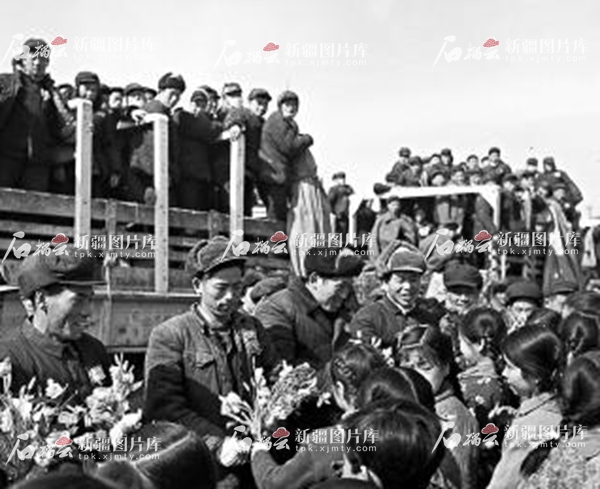1959年3月14日,各族少先隊(duì)員向支援邊疆建設(shè)的安徽青壯年獻(xiàn)花。 新疆日報(bào)記者宋士敬攝 圖片由新疆圖片庫提供