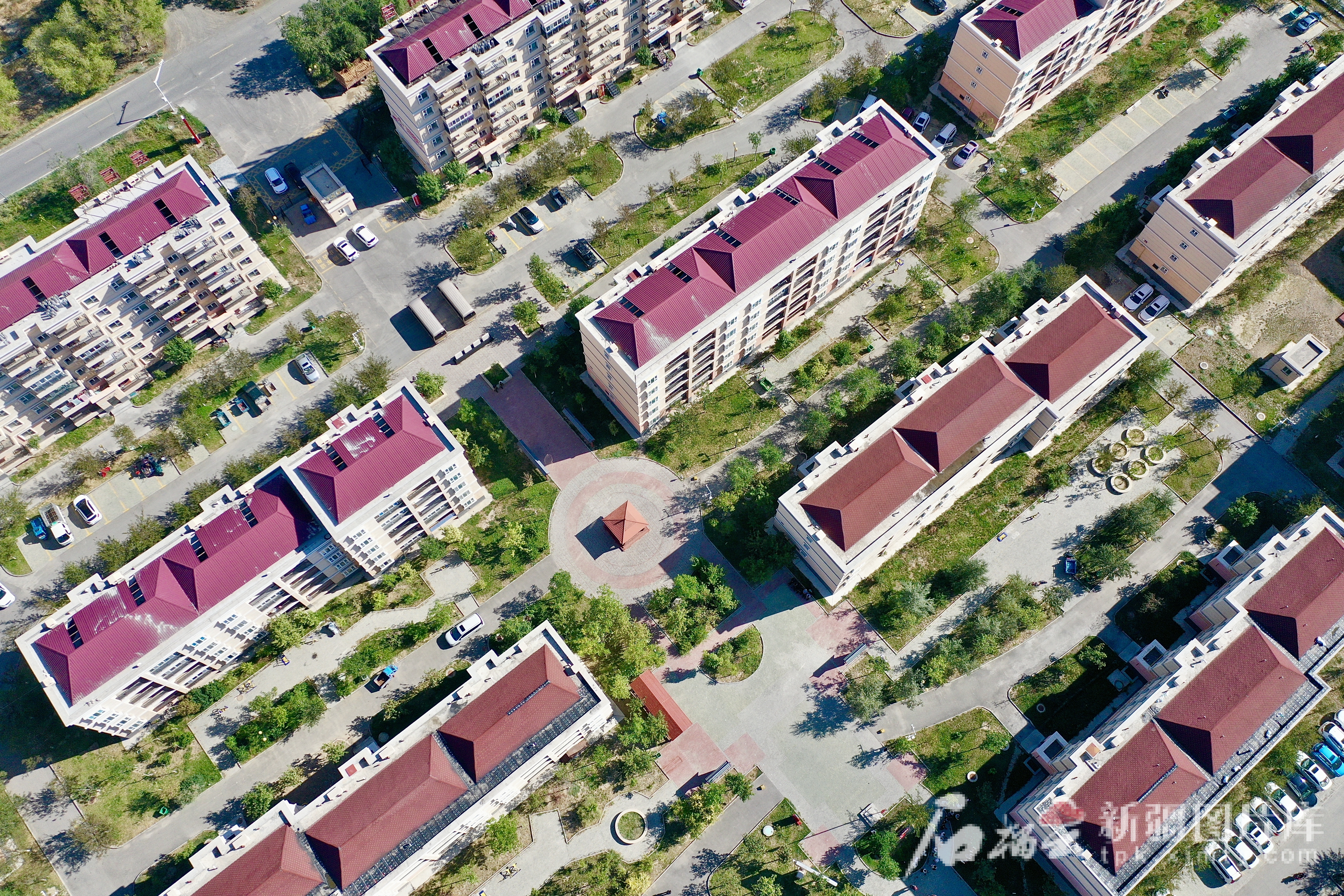 8月12日,昌吉市阿什里鄉(xiāng)的“天鵝小鎮(zhèn)”,一排排整齊的樓房。(無人機攝)