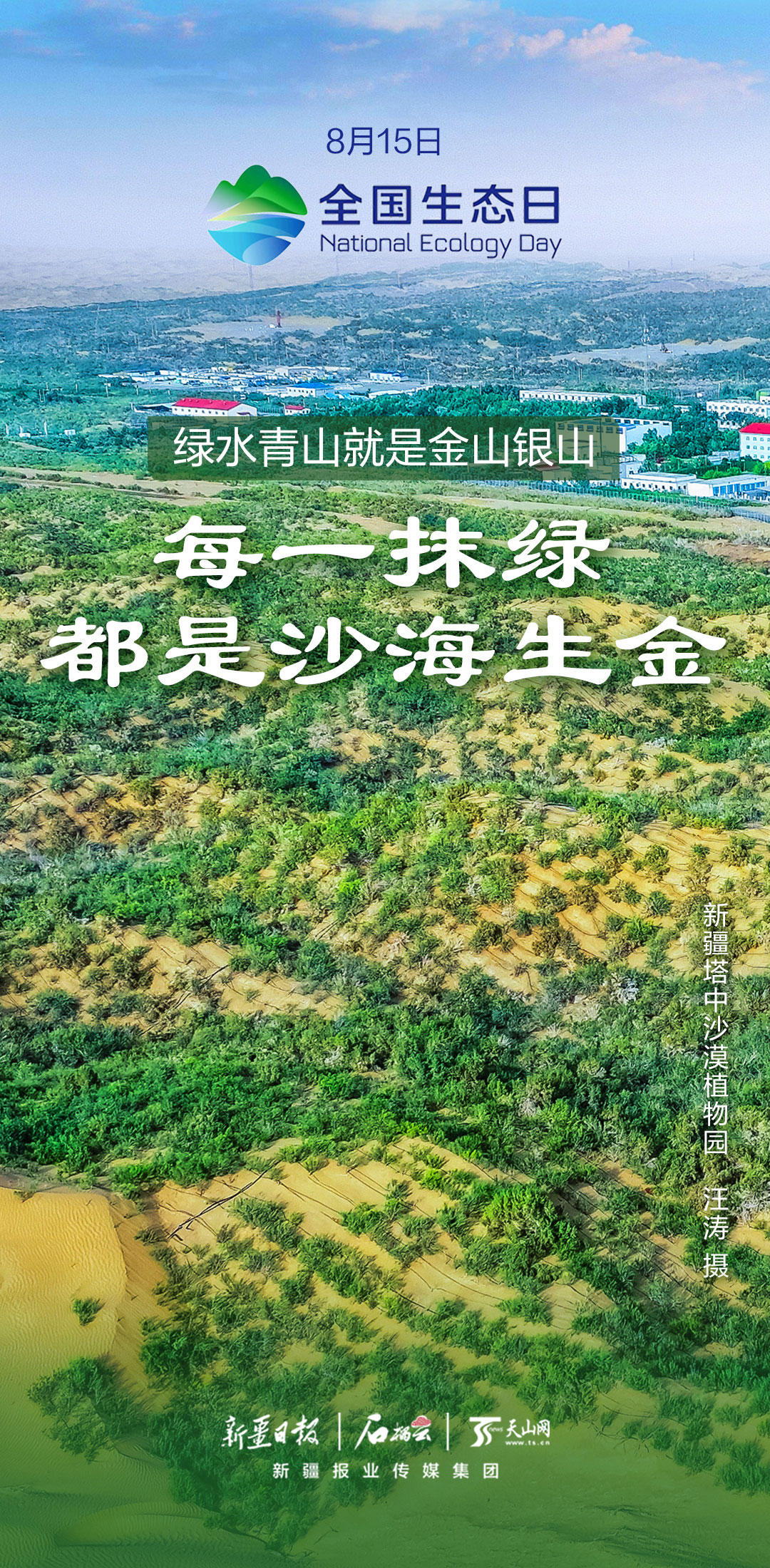 8月15日是第三個(gè)全國(guó)生態(tài)日,主題為“綠水青山就是金山銀山”。新疆塔中沙漠植物園在世界第二大流動(dòng)沙漠腹地上書(shū)寫(xiě)著綠色奇跡——每一抹綠,都是沙海生金。