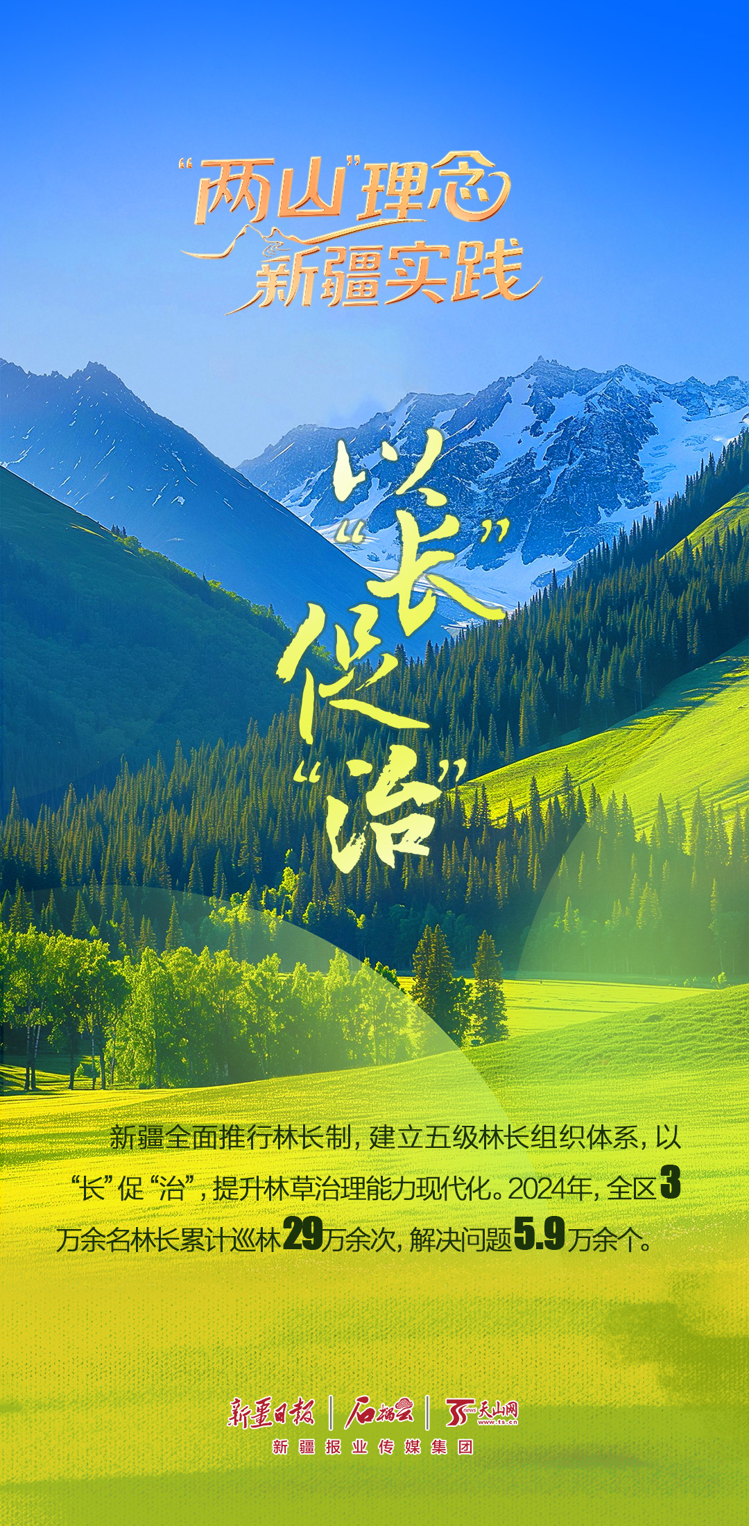 新疆全面推行林長制,建立五級林長組織體系,以“長”促“治”,提升林草治理能力現(xiàn)代化。2024年,全區(qū)3萬余名林長累計巡林29萬余次,解決問題5.9萬余個。