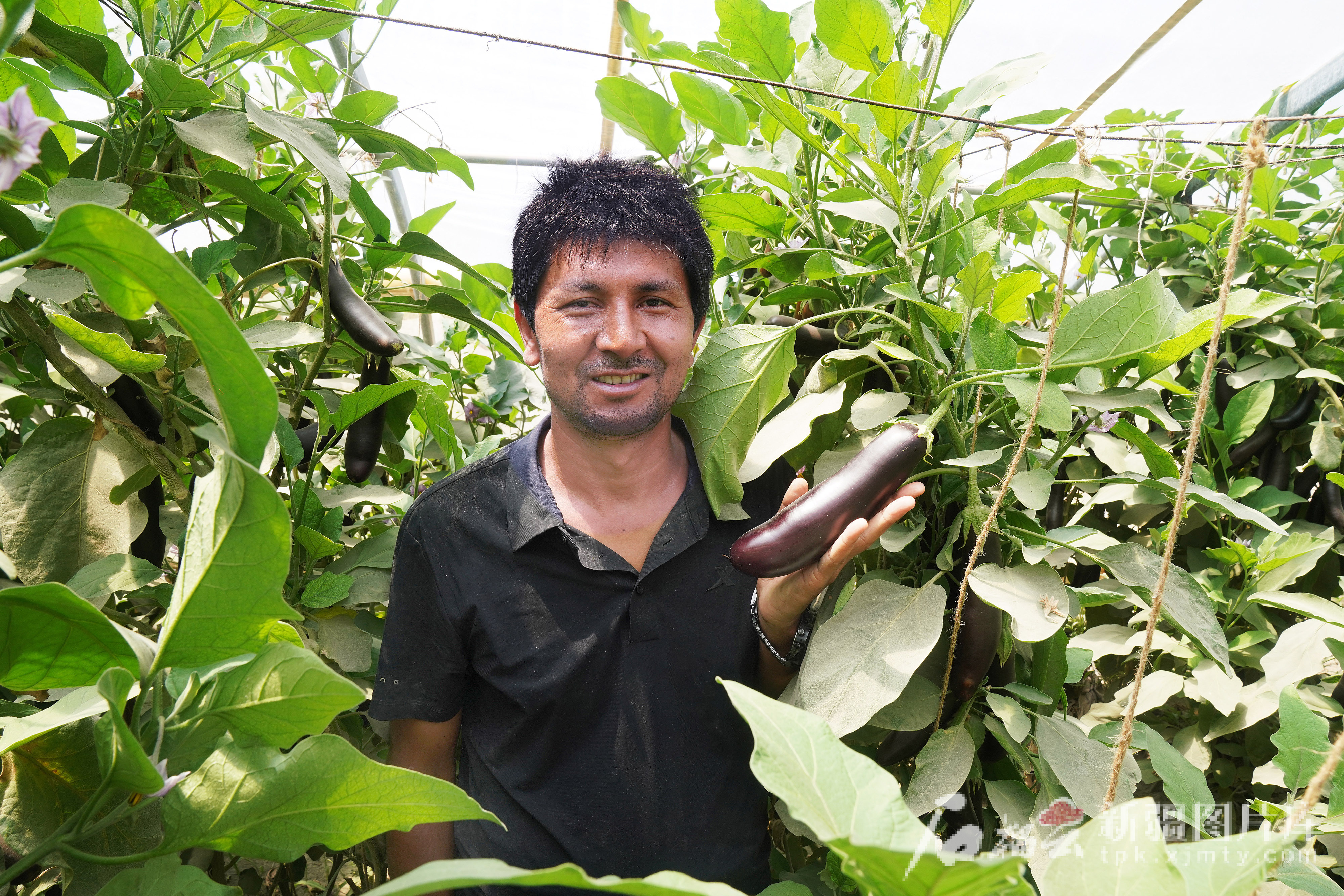 葉城縣阿克塔什鎮(zhèn)安民村村民努爾艾力·麥合木提向記者展示種植的茄子。天山網(wǎng)-新疆日?qǐng)?bào)記者 拍熱扎提·阿不都 攝