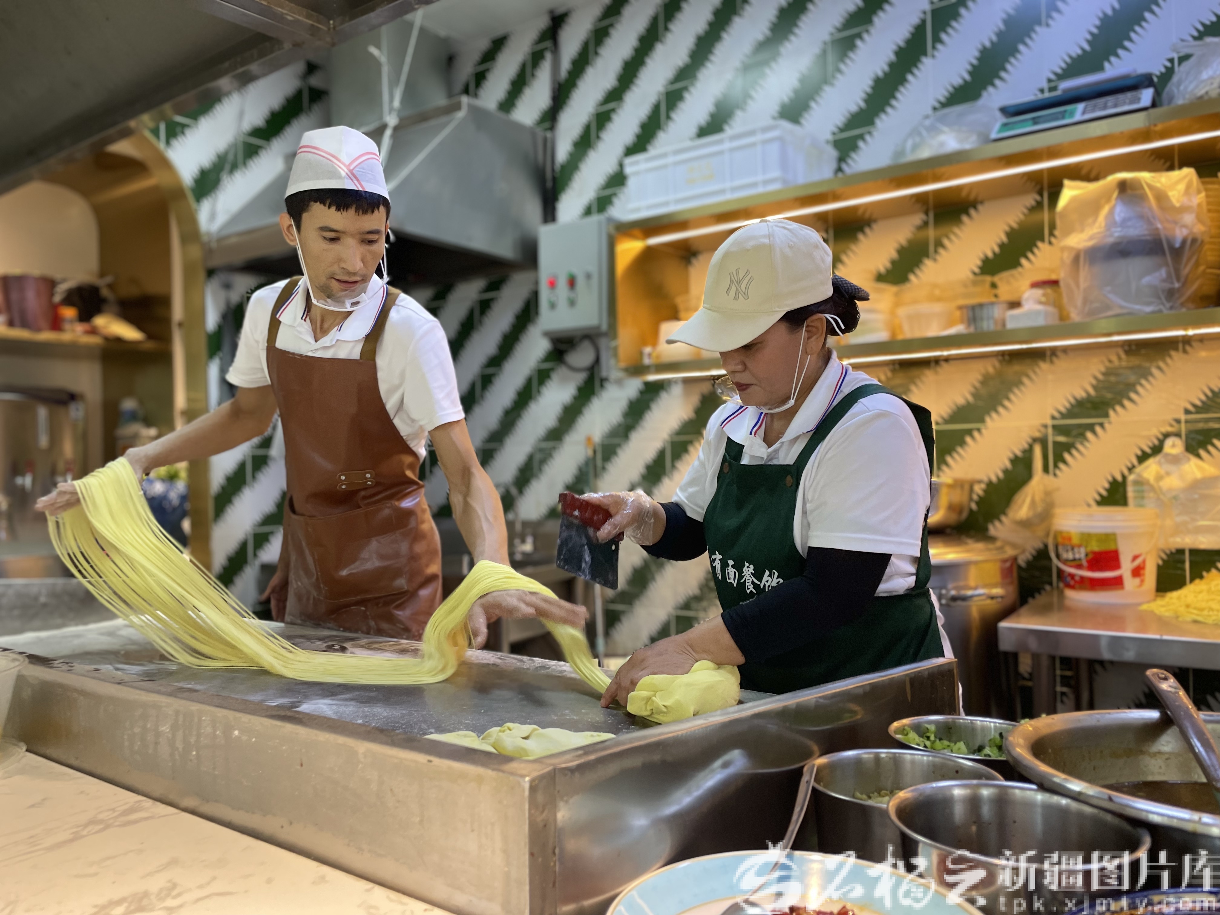 8月15日,烏魯木齊市米東區(qū)米古里水游城一期的馬有面餐飲店里,馬占梅在和拉面師傅切面。天山網(wǎng)-新疆日?qǐng)?bào)記者 索蓉芝攝