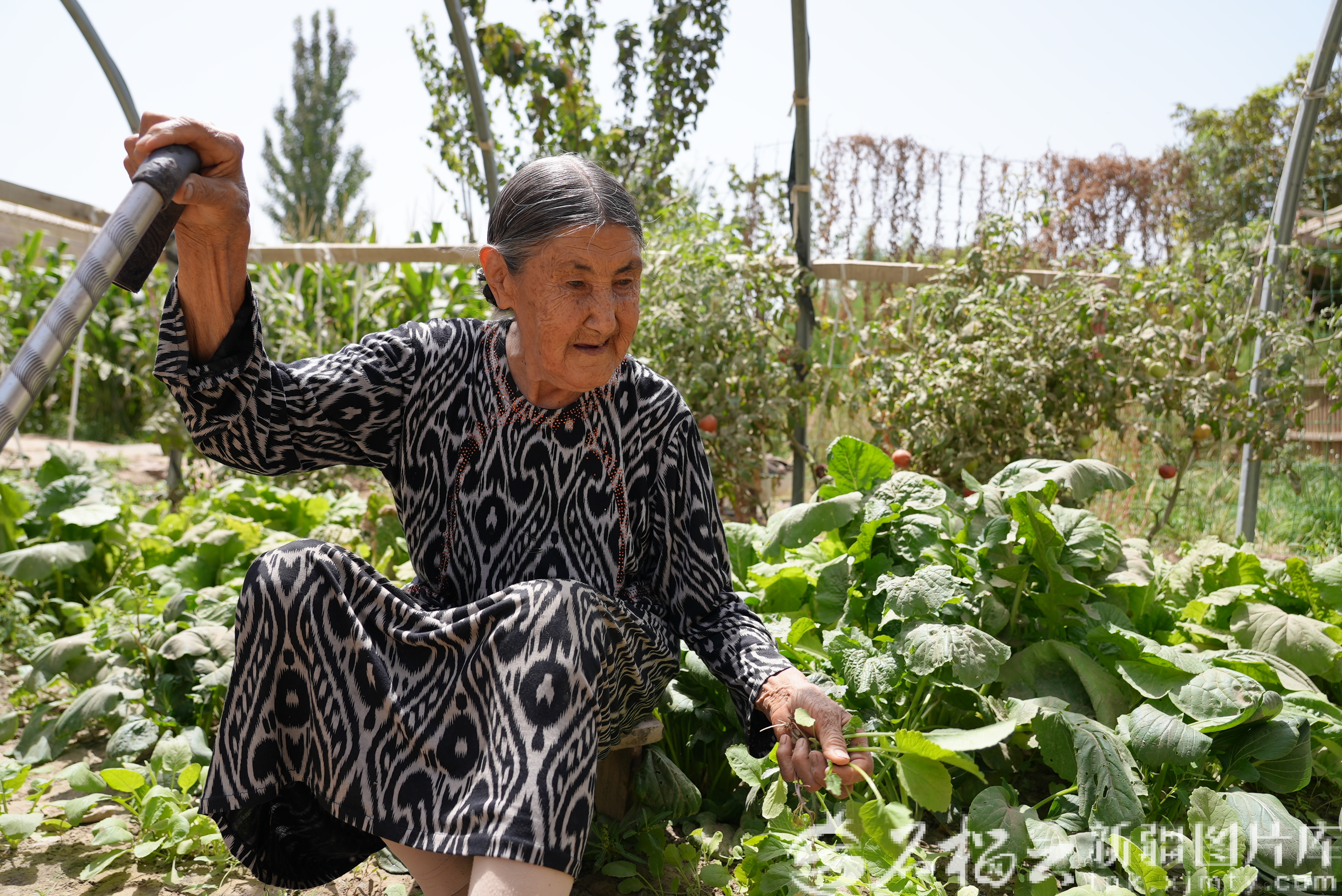 拉依蘇村村民艾吾孜汗·賽杜拉在自家菜園摘恰瑪古苗。龍振華供圖