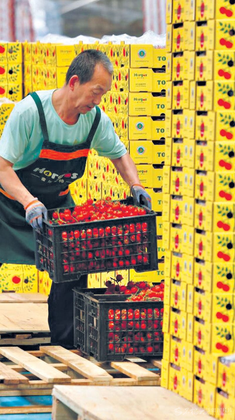 8月16日,工作人員在霍爾果斯現代農業(yè)科技產業(yè)園裝運番茄。該產業(yè)園智能大棚的番茄產量是普通大棚的7倍到10倍,每畝產值達40萬元。