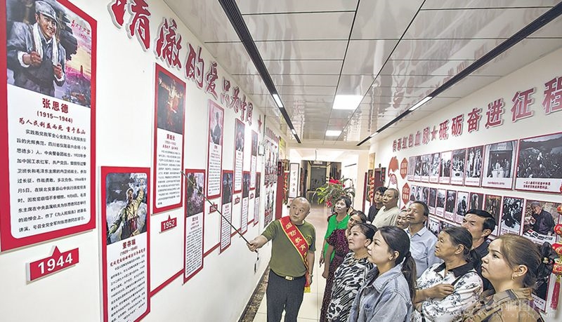 9月1日,市民在庫車市愛國擁軍促進會的軍旅展廳參觀,聆聽講解員講述英烈事跡。 □袁歡歡攝