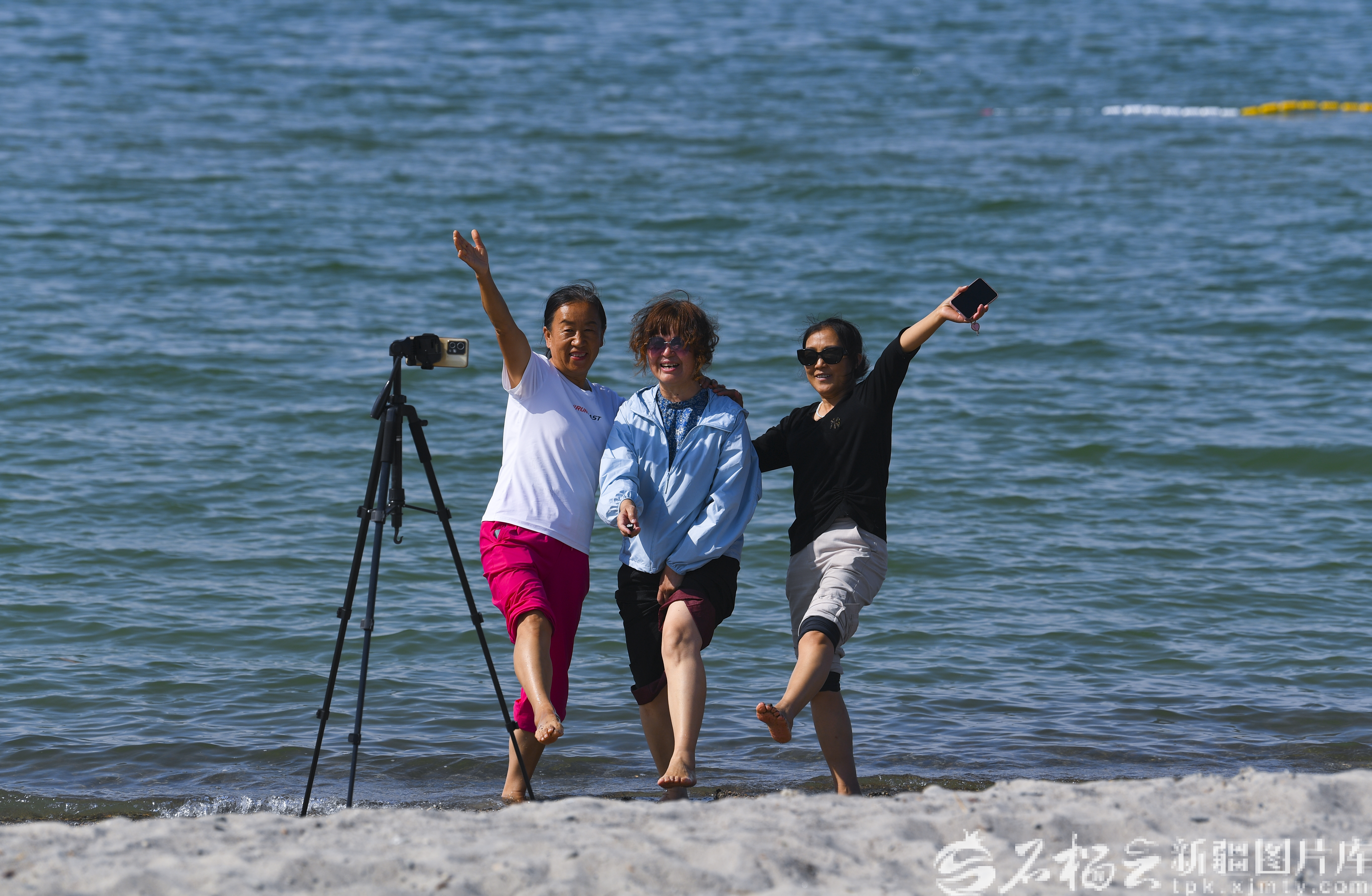9月8日,游客在烏倫古湖金沙灘景區(qū)戲水。