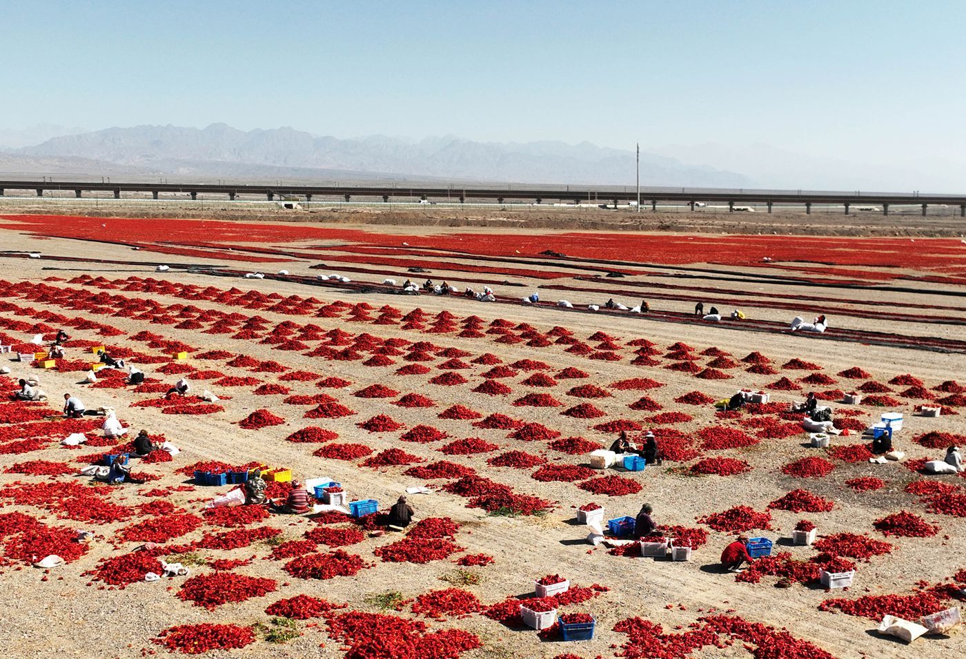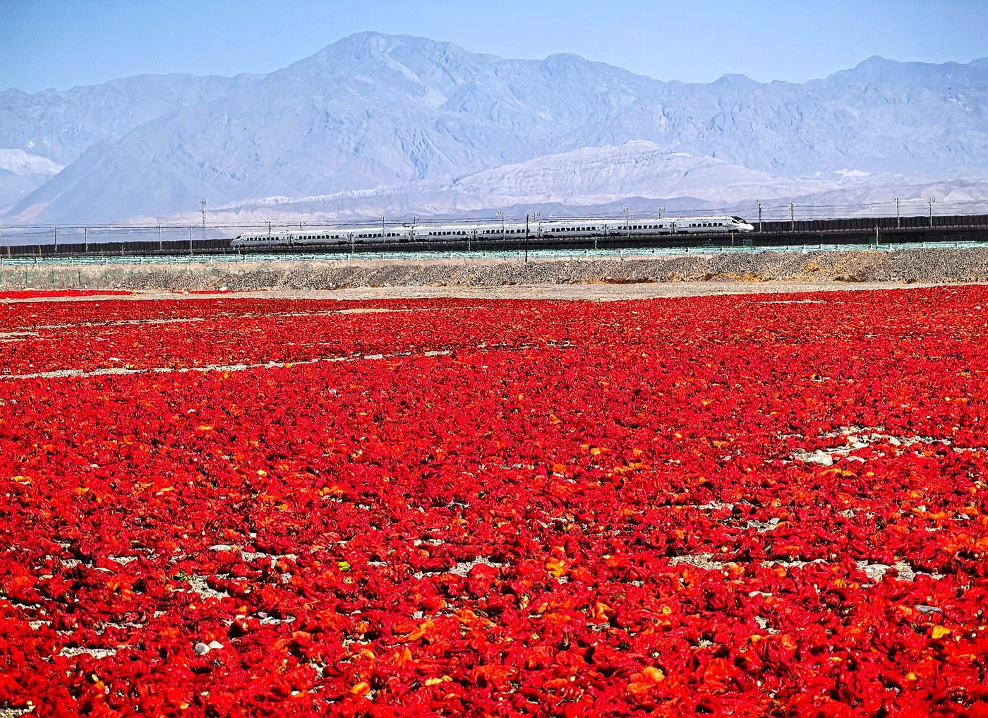 9月16日,新疆吐魯番市高昌區(qū)紅柳河的廣袤戈壁上,火紅一片的辣椒晾曬場呈現(xiàn)豐收的壯觀。一列高鐵從旁邊疾馳而過,宛如穿梭于紅毯上,構成一幅有趣的畫面。