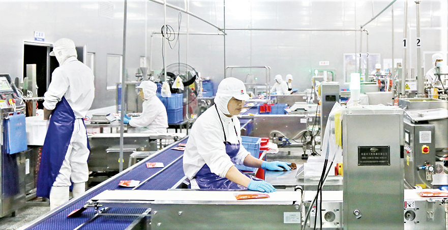 9月17日,在福建紫山集團(tuán)股份有限公司生產(chǎn)車間,工人們?cè)谏a(chǎn)拌面醬料包。福建紫山集團(tuán)股份有限公司供圖