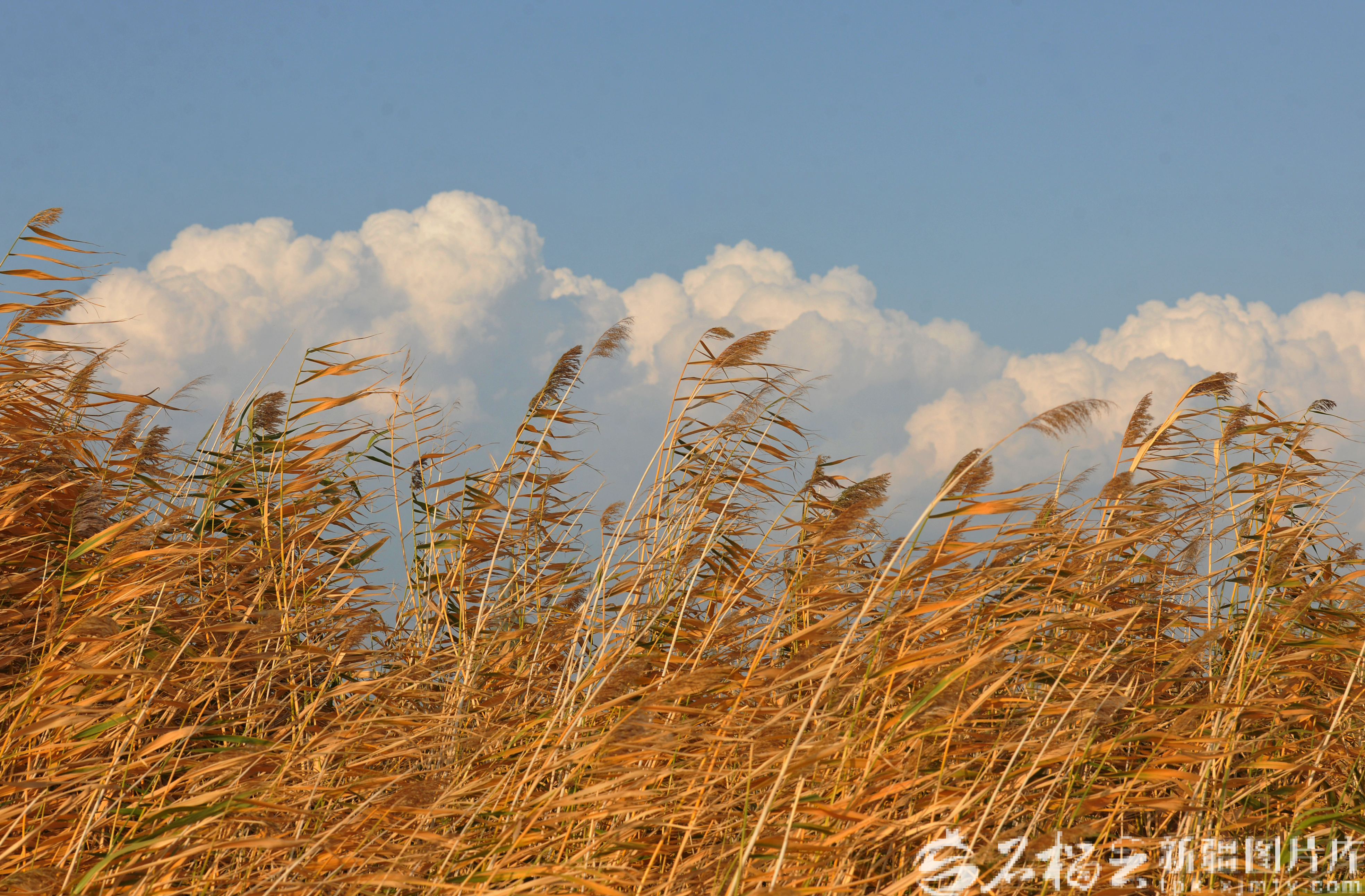 9月21日, 金色蘆葦蕩與藍天白云相映成趣。