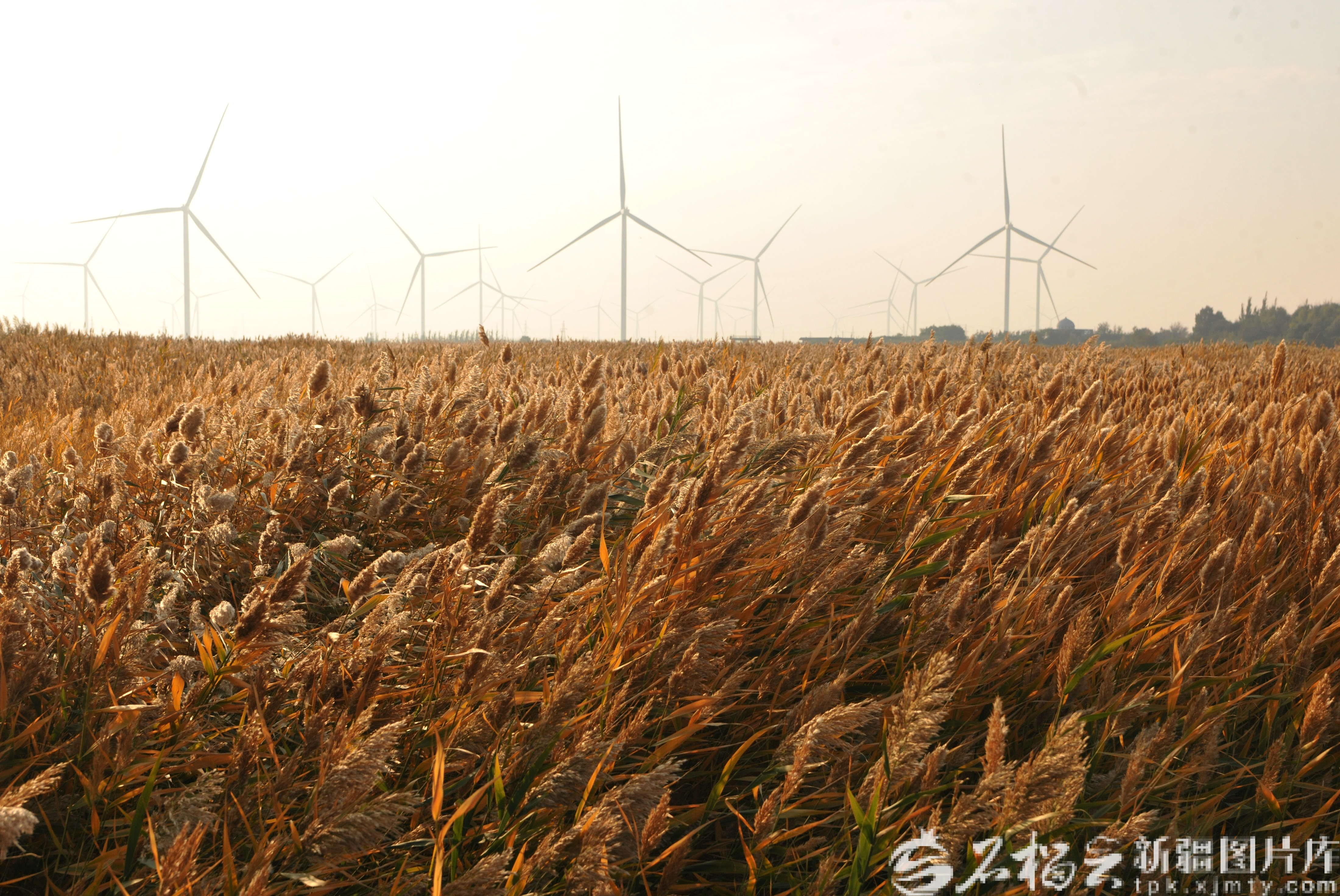 秋日的蘆葦蕩在暖光中鋪展,遠處的風車在轉動,勾勒出獨特景致(9月21日攝)。
