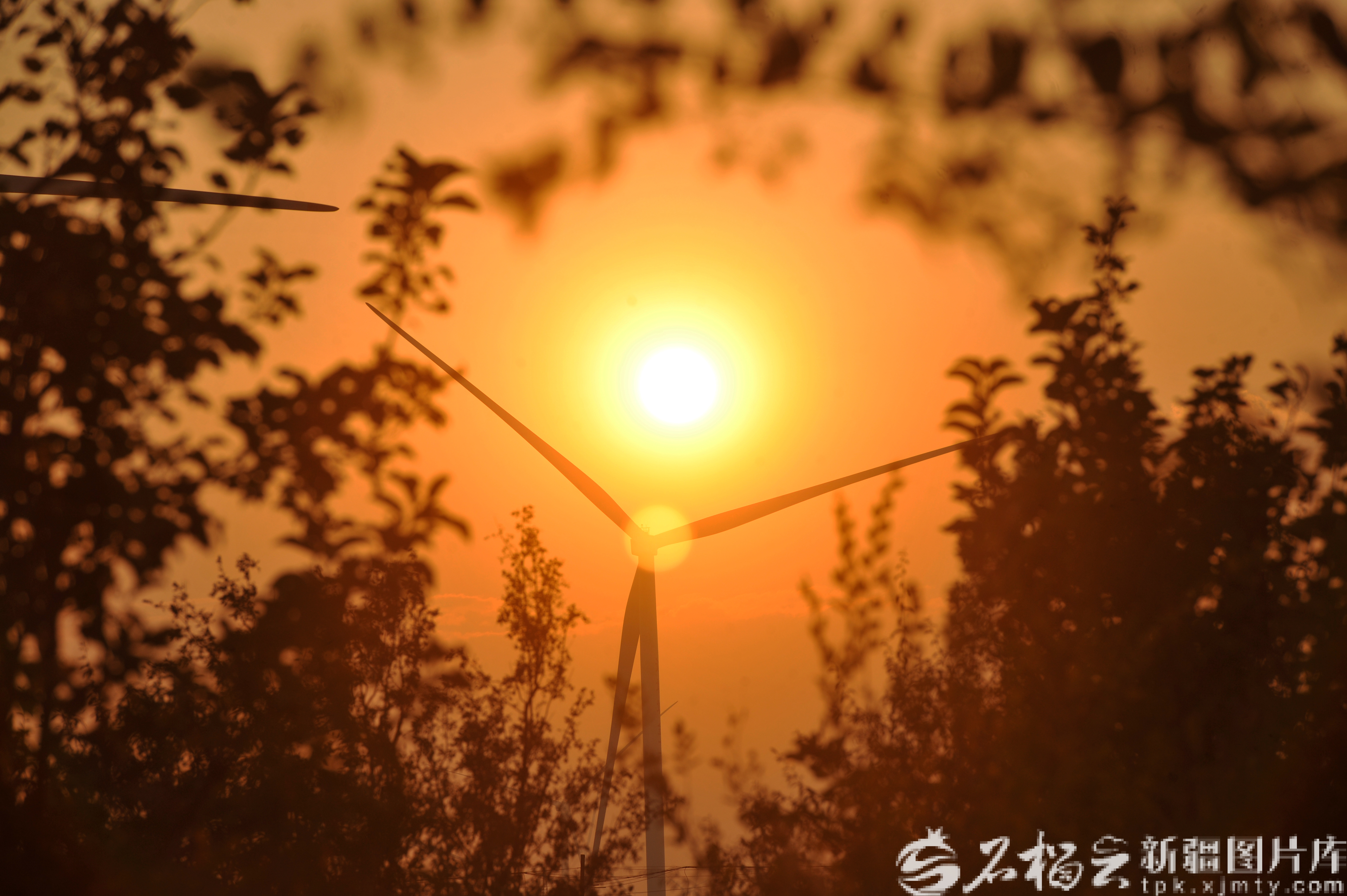 夕陽下,風車在樹木剪影的映襯中,與金黃的天空共同構成一幅詩意畫面(9月21日攝)。