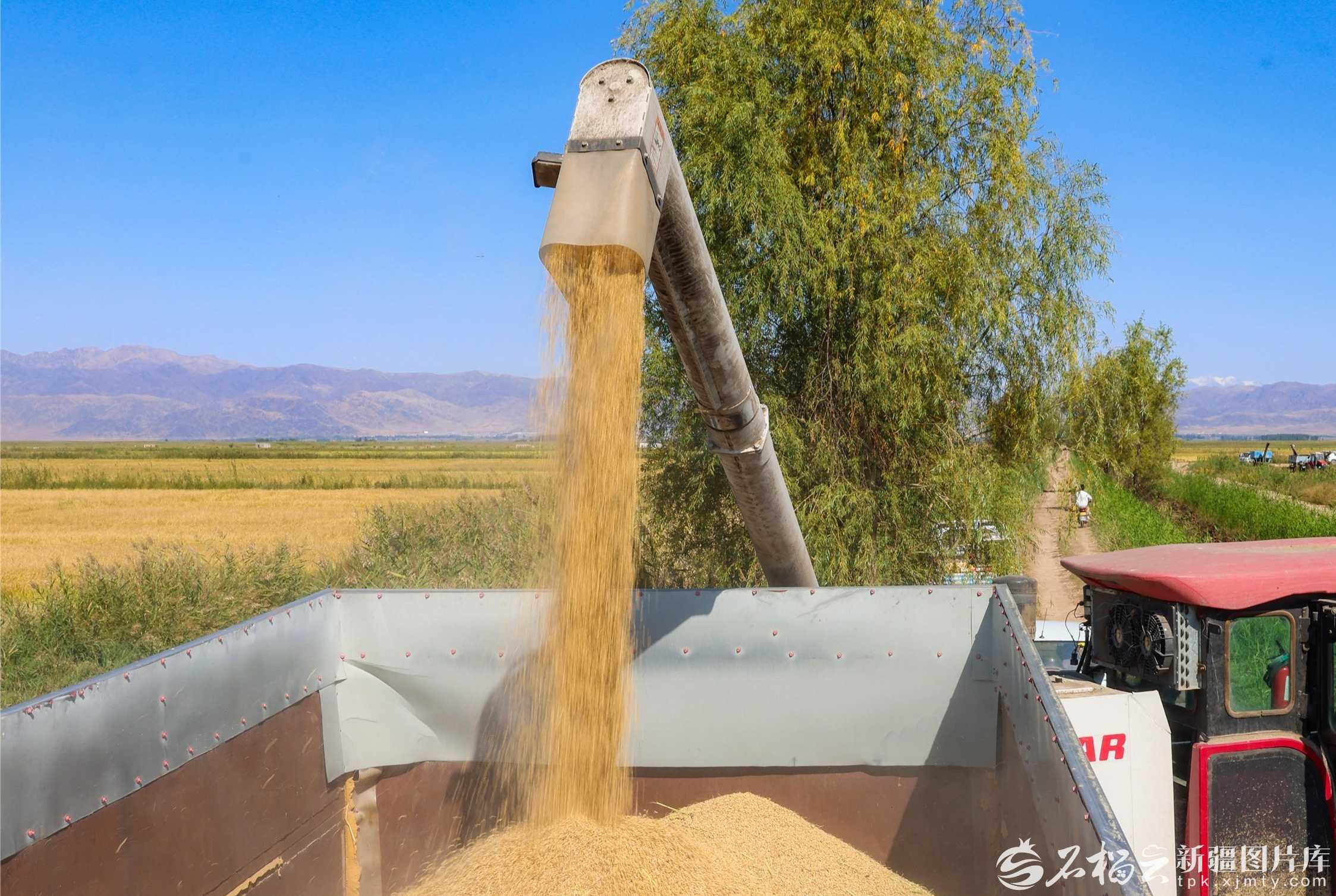 9月22日,收割機(jī)在新源縣肖爾布拉克鎮(zhèn)喀克村水稻田里作業(yè)。張文庭攝