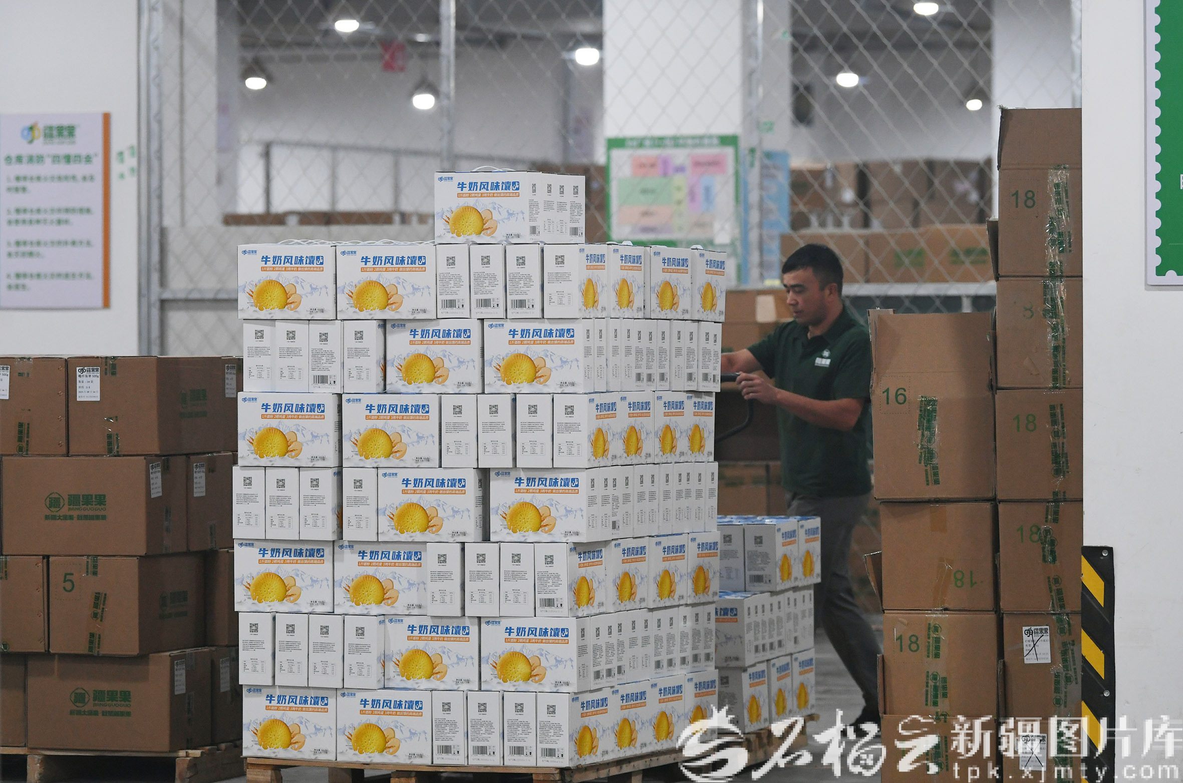 9月20日,員工在位于疏附縣的喀什疆果果農(nóng)業(yè)科技有限公司生產(chǎn)車間搬運(yùn)用堅(jiān)果加工的牛奶風(fēng)味馕產(chǎn)品。