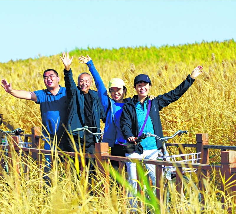 9月17日,游客在烏魯木齊柴窩堡湖國家濕地公園游玩。秋色正濃,該濕地公園進入最佳觀賞期,吸引游客前來感受自然之美。石雪攝