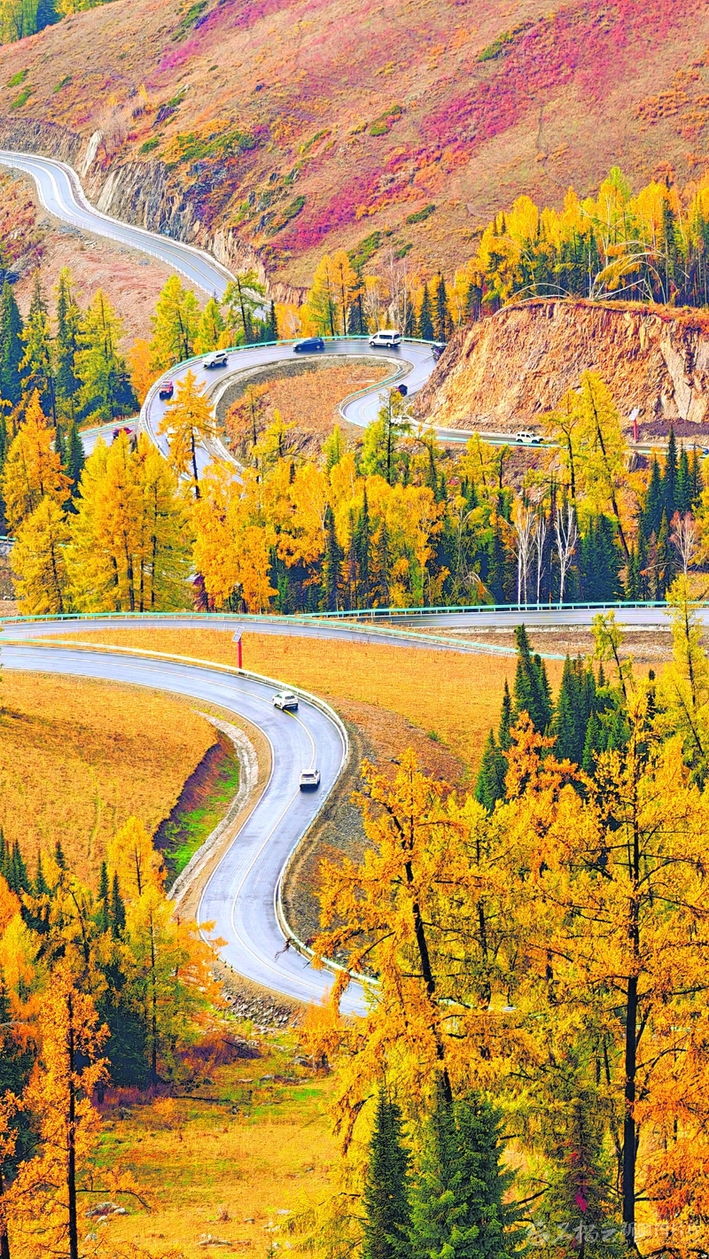 9月21日,自駕車輛行駛在阿禾公路上。金秋時節(jié)的阿禾公路兩旁層林盡染,宛若一幅絢麗多彩的油畫。劉新海攝