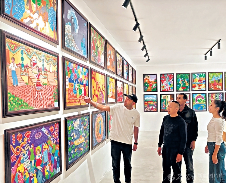 9月26日,在阿瓦提縣阿瓦提鎮(zhèn)博斯坦社區(qū)刀郎文化非遺傳承中心,游客欣賞多彩的農(nóng)民畫。包良廷攝