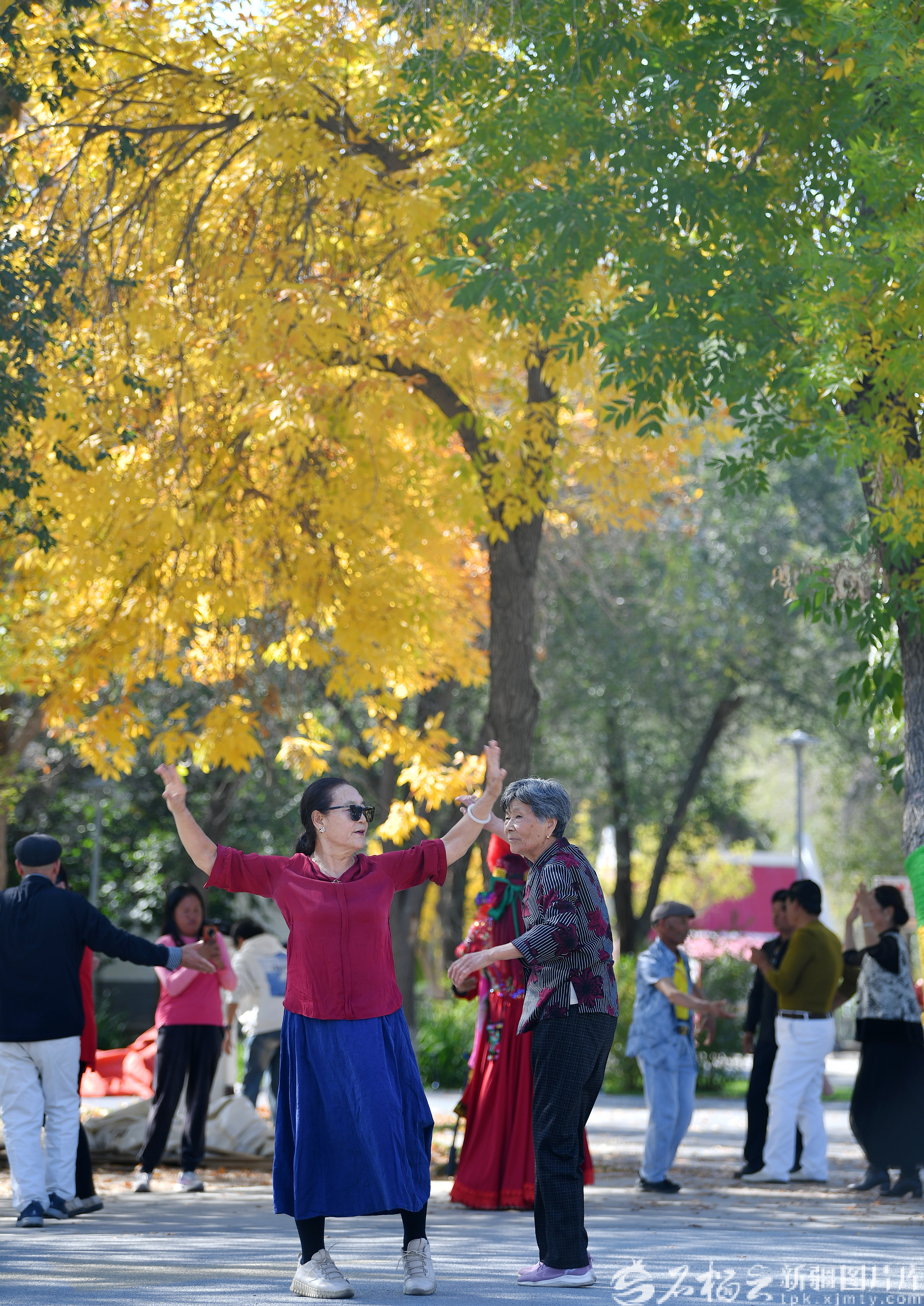 9月29日,市民在秋意漸濃的烏魯木齊市兒童公園跳民族舞蹈。